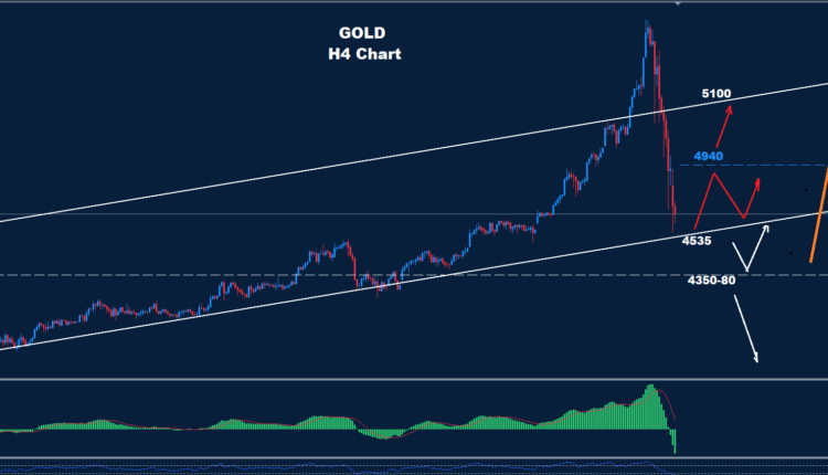 As we see from the chart, the market is closing towards the support trend around 4535, which could give the chance for a rebound toward 4785, 4885 and 4940.