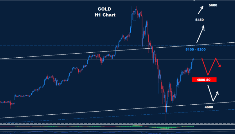 Gold managed to add more rebound as prices close towards the 5100-200 resistance zone.