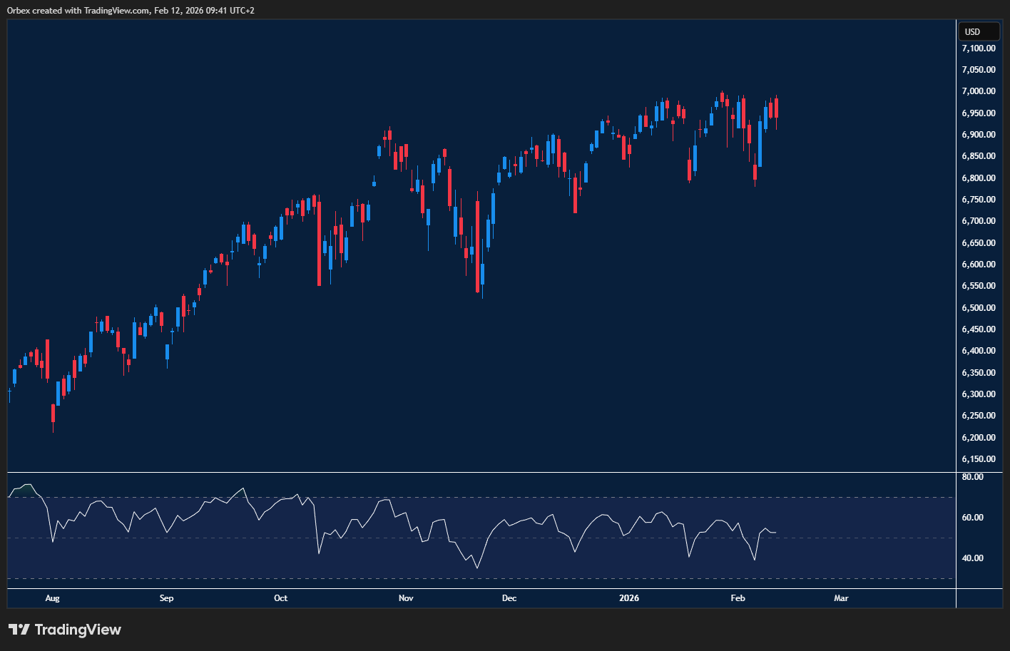 The stock market remains bullish, as a decent earnings season has led big tech companies to move higher. Driving most of the gains was a combination of cooler-than-expected inflation data and a progressive outlook for most sectors. However, fears are always around the corner, and some investors are awaiting further market corrections as the AI bubble hovers overhead. 7000 is the next step higher, with 6750 a critical support.