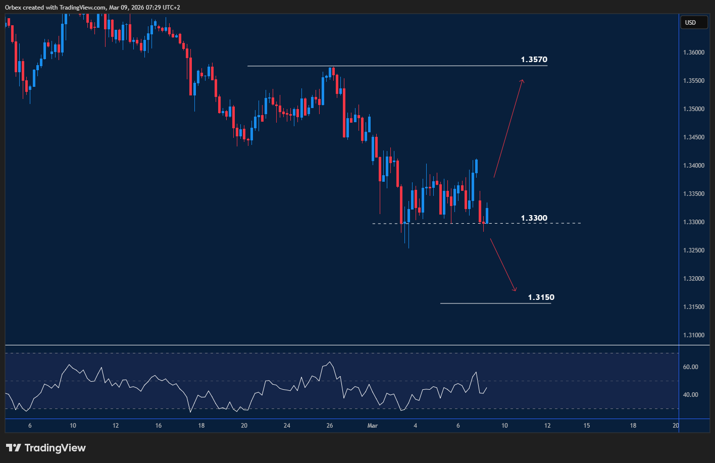 The pound attempts to claw back losses as price action reverses sharply. The near-term outlook supports the dollar recovery theme after the pair bounced back towards 1.3300. The recent surge lower could continue if prices remain bearish, with 1.3150 acting as a critical floor. On the chart, the pair needs to move past 1.3400, which could lead to a push towards 1.3570, as the RSI remains in the neutral area.