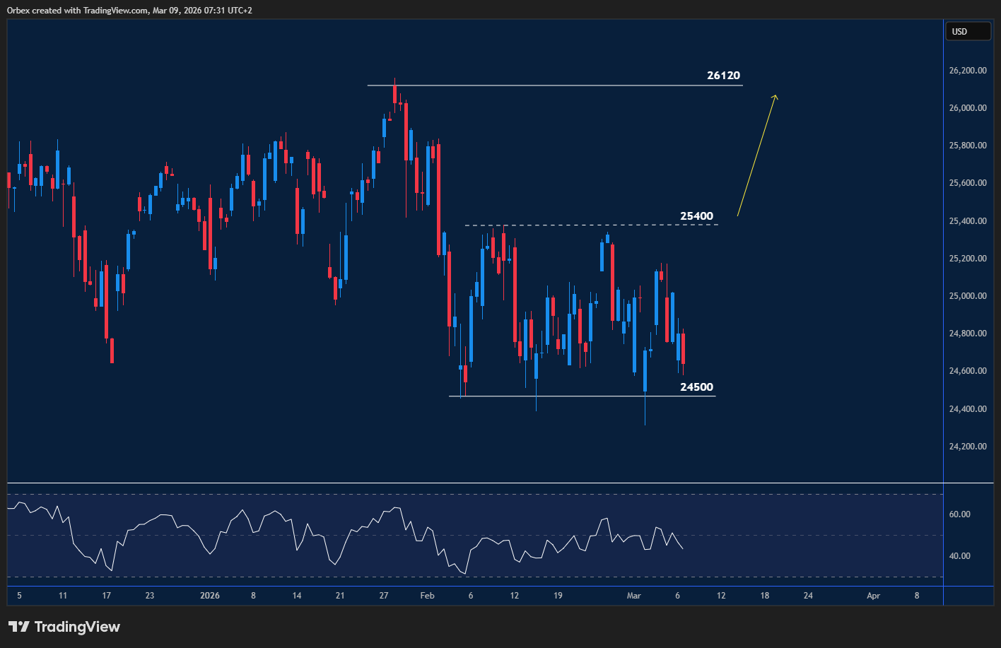 The Nasdaq fell lower as America looks towards an ongoing conflict in the Middle East. The index took a step back after crashing through the 25000 level as traders now look for a test at 24500. However, the RSI’s fall could open a bullish divergence, leading to a move back to 25400. If the pressure does remain, bears will have an easy choice: stay in the market, with 24500 as the next target at the base of the previous support.