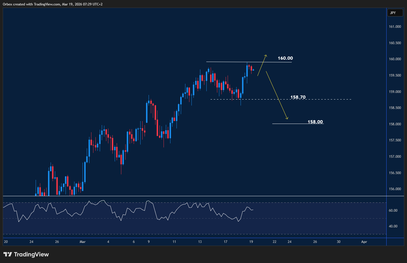 The Japanese Yen remains pressured as a rising dollar tested the 160.00 level. A subsequent break past this psychological level would indicate strong buyer commitment. However, with a bearish divergence emerging on the RSI, a bounce lower would attract momentum sellers looking to cash in on the dip. A break below 158.70 would attract more bears and send the pair to the previous swing low at 158.00
