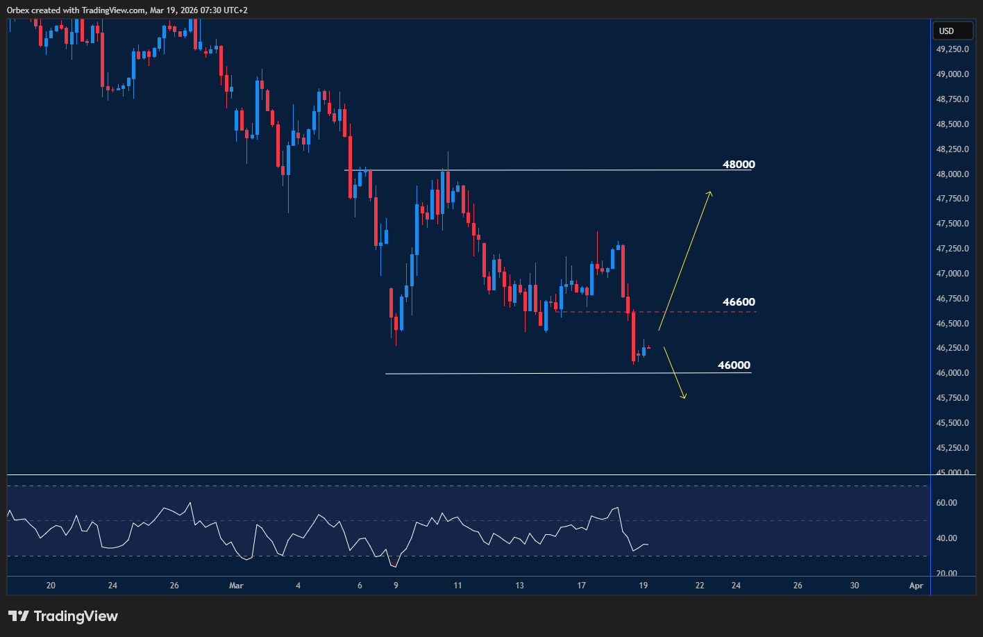 The Dow Jones index dropped over 1,000 points as traders digest the latest comments from the Fed. On the chart, the index is looking for some retracement as price action finds some support. A break at 46600 could look for some recovery in the medium term. The general sentiment remains bearish, as inflation is expected to rise. The bounce around 46000 has kept bulls in check, but its breach would force bears to open the door to an extended rally to 45000.