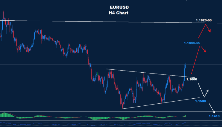 Resistance at 1.1800-35 caused a drop while supports at 1.1600 could create a trading zone.