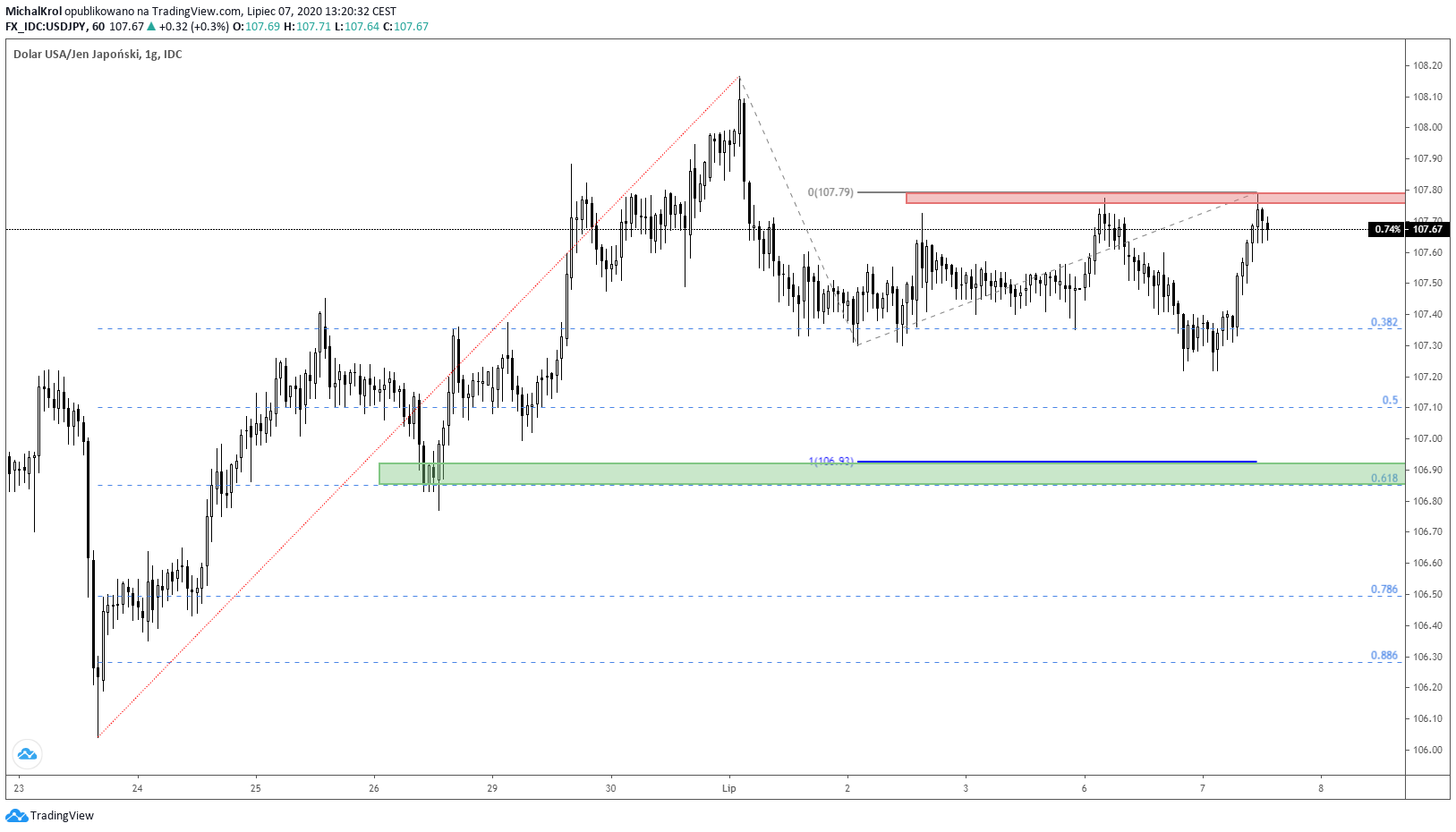 Ciekawy moment pojawi się na wykresie godzinowym Ujka, gdzie notowania testują lokalny opór po kursie 107,77. Podczas poniedziałkowej sesji azjatyckiej wyznaczony został tam wierzchołek, który stanowił maksimum z obecnego tygodnia.