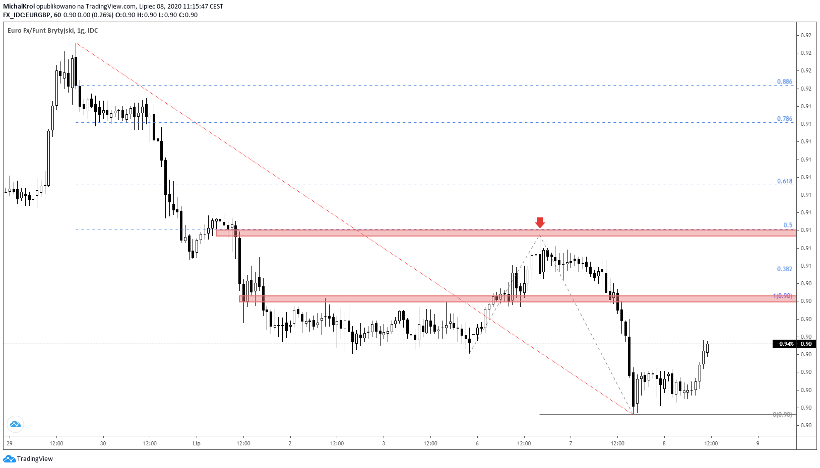 Środowa sesja jest kontynuacją odreagowania notowań EURGBP i korekty wzrostowej. Naturalnym targetem jest poziom cenowy (0,9085), który wynika z mierzenia FE100 na korekcie pędzącej. Patrząc na pierwsze sesje lipca, wspomniana strefa podażowa stanowiła już istotny opór dla rynku.