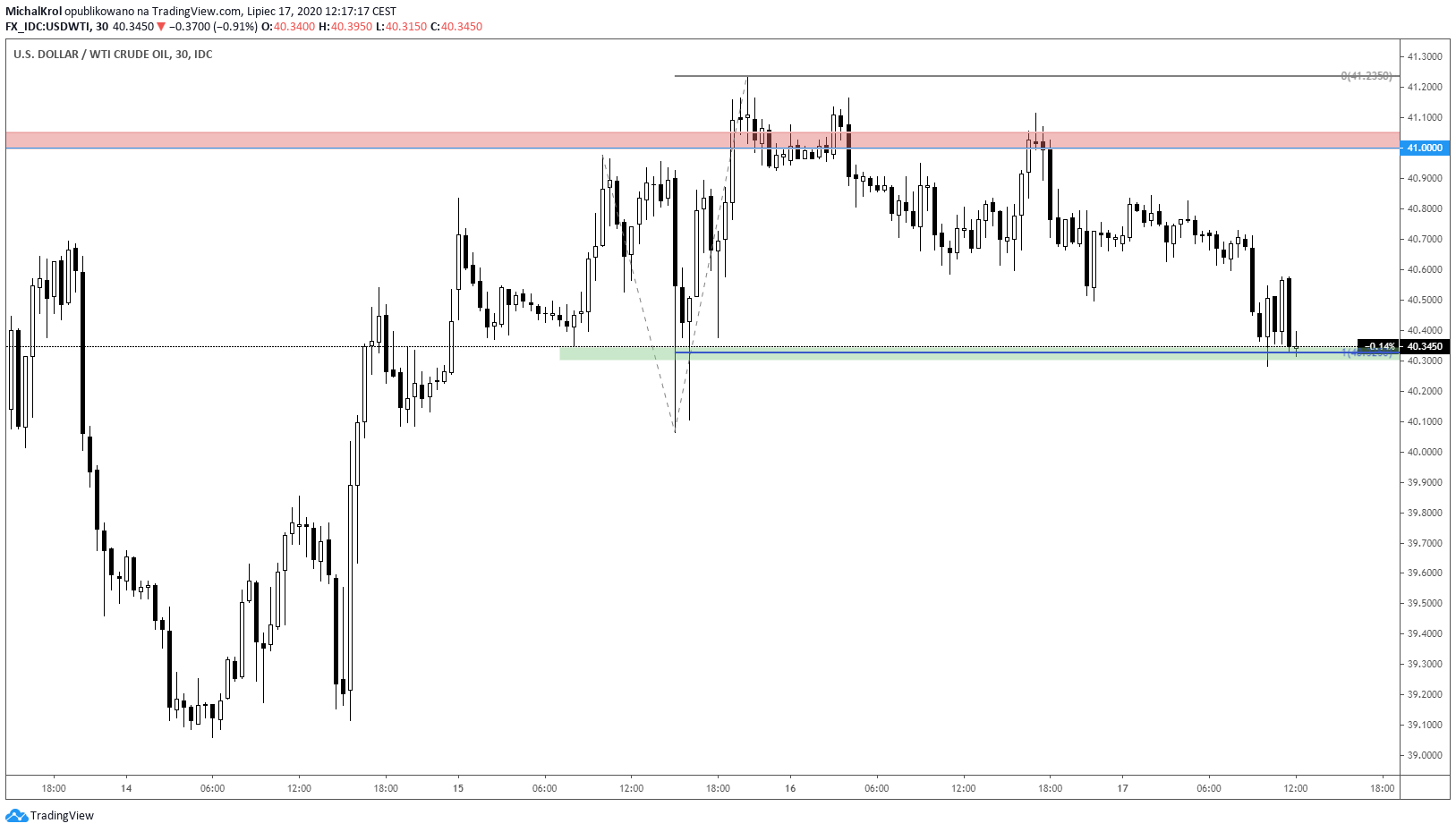 Poniższy wykres obejmuje notowania ropy naftowej w obecnym tygodniu. Zakres wahań obejmuje przedział cenowy 39 – 41 dolarów za baryłkę WTI. Lokalny swing wzrostowy budowany był od wtorkowego poranka, a wierzchołek ukształtował się w środowy wieczór.