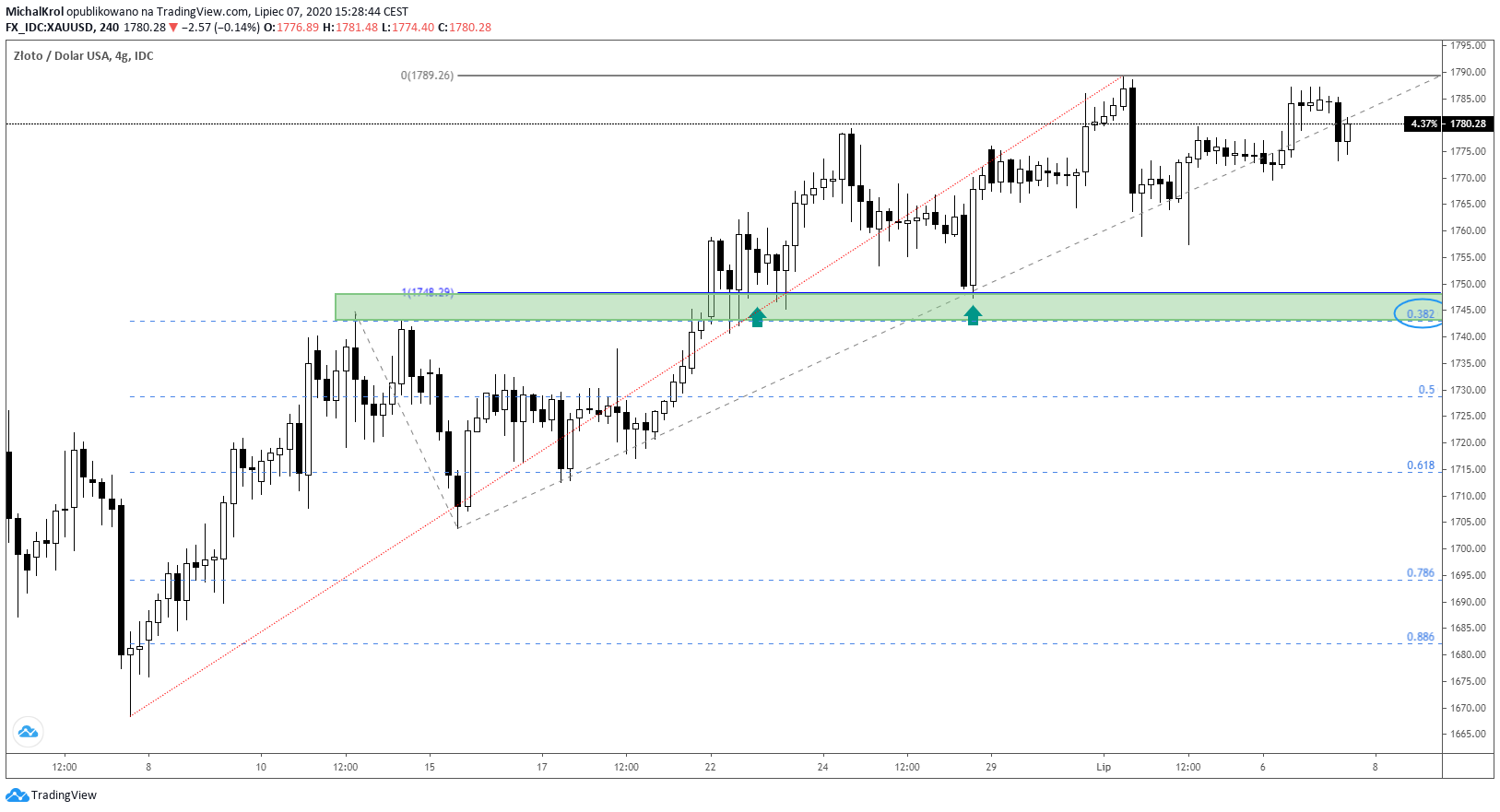 Przygotowany jest również scenariusz z układem korekcyjnym OneToOne. Strefa wsparcia na ten moment wypada w okolicy lokalnego dołka po cenie 1745 USD. Na tą chwilę bardziej prawdopodobne wydaje się być wybicie górą, jednak warto być również przygotowanym na zmianę tendencji w kierunku południowym.