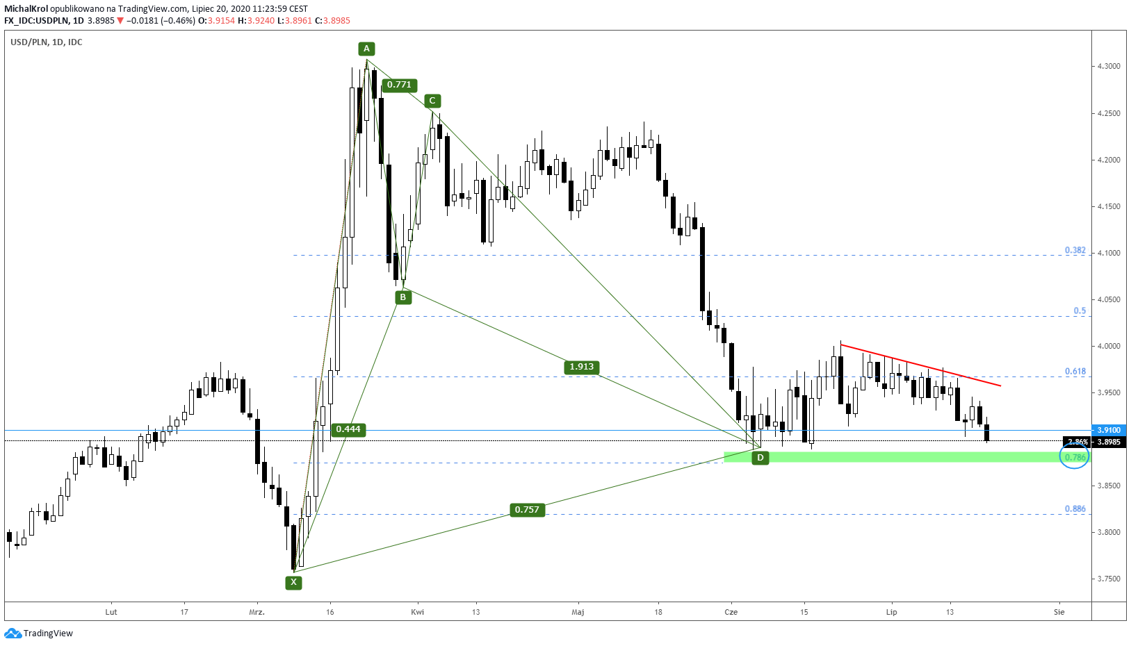 Nowy tydzień rozpoczyna się od kontynuacji piątkowych spadków. Bardzo prawdopodobna jest kolejna próba wybicia dołem strefy wsparcia 3,8800. Byłby to retest struktury harmonicznej, który w większości przypadków widoczny jest na wykresach. Dodatkowym potwierdzeniem może być mniejsza zmienność i konsolidacja, która utrzymując się będzie motywem przewodnim pod długa pozycję.