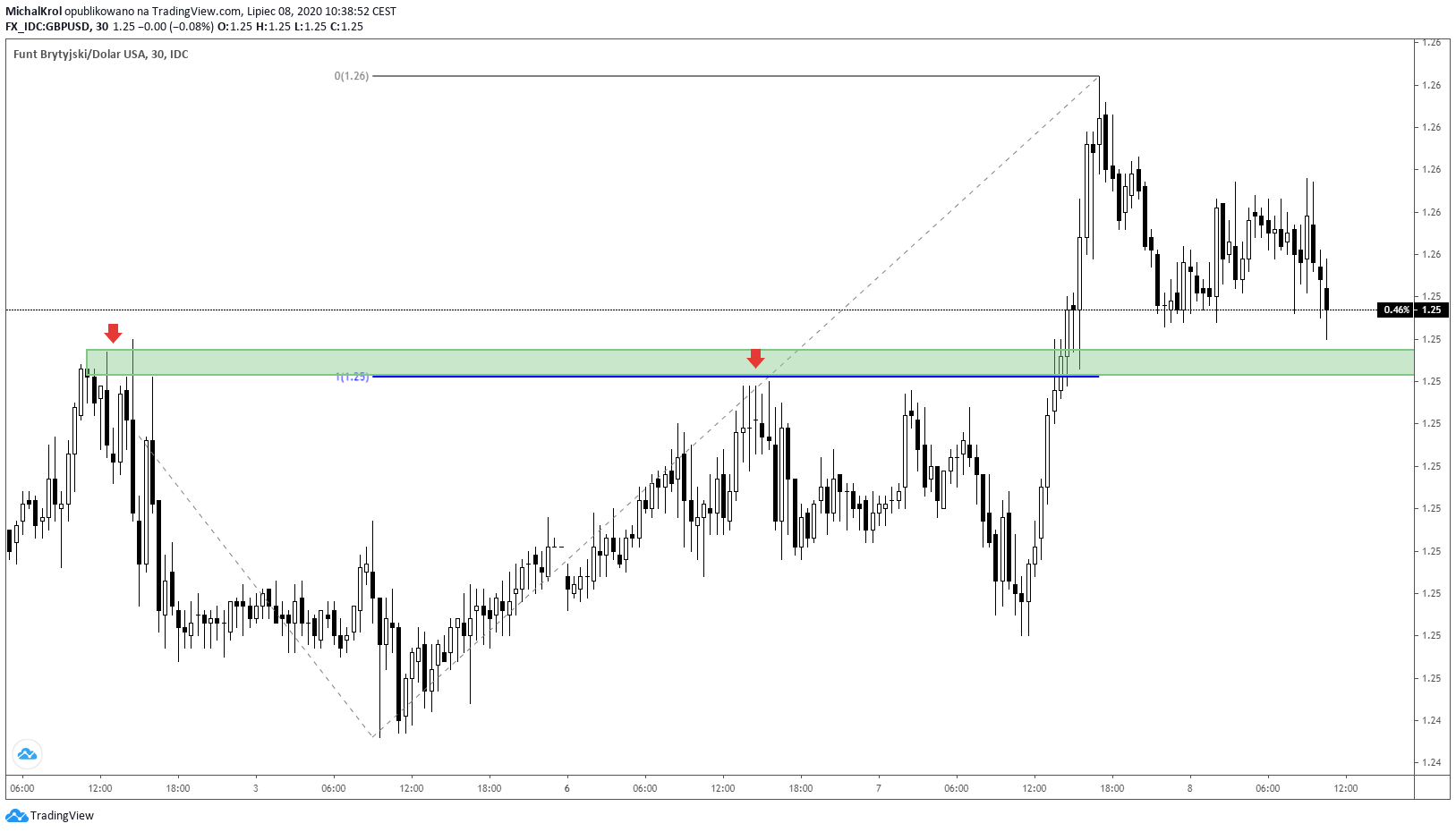 Warto zwrócić uwagę na reakcję ceny kiedy pojawi się wyraźny test analizowanego obszaru. Wykres obejmuje interwał 30-minutowy dlatego warto wziąć pod uwagę zamknięcia konkretnych świec. Jeżeli nie pojawi się wyraźny sygnał popytowy, wszelkie próby rozgrywania długich pozycji mogą skończyć się kosztownie.