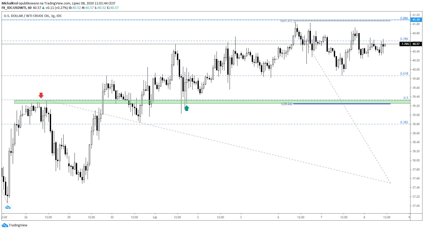 Obecny tydzień przynosi uspokojenie nastrojów. Pozostawia to otwarte scenariusze wzrostowe jak i spadkowe. Odniesienie do strefy podażowej zostało przedstawione powyżej wykresu. W przypadku najbliższego targetu spadkowego pojawia się poziom cenowym 39,25 USD za baryłkę.