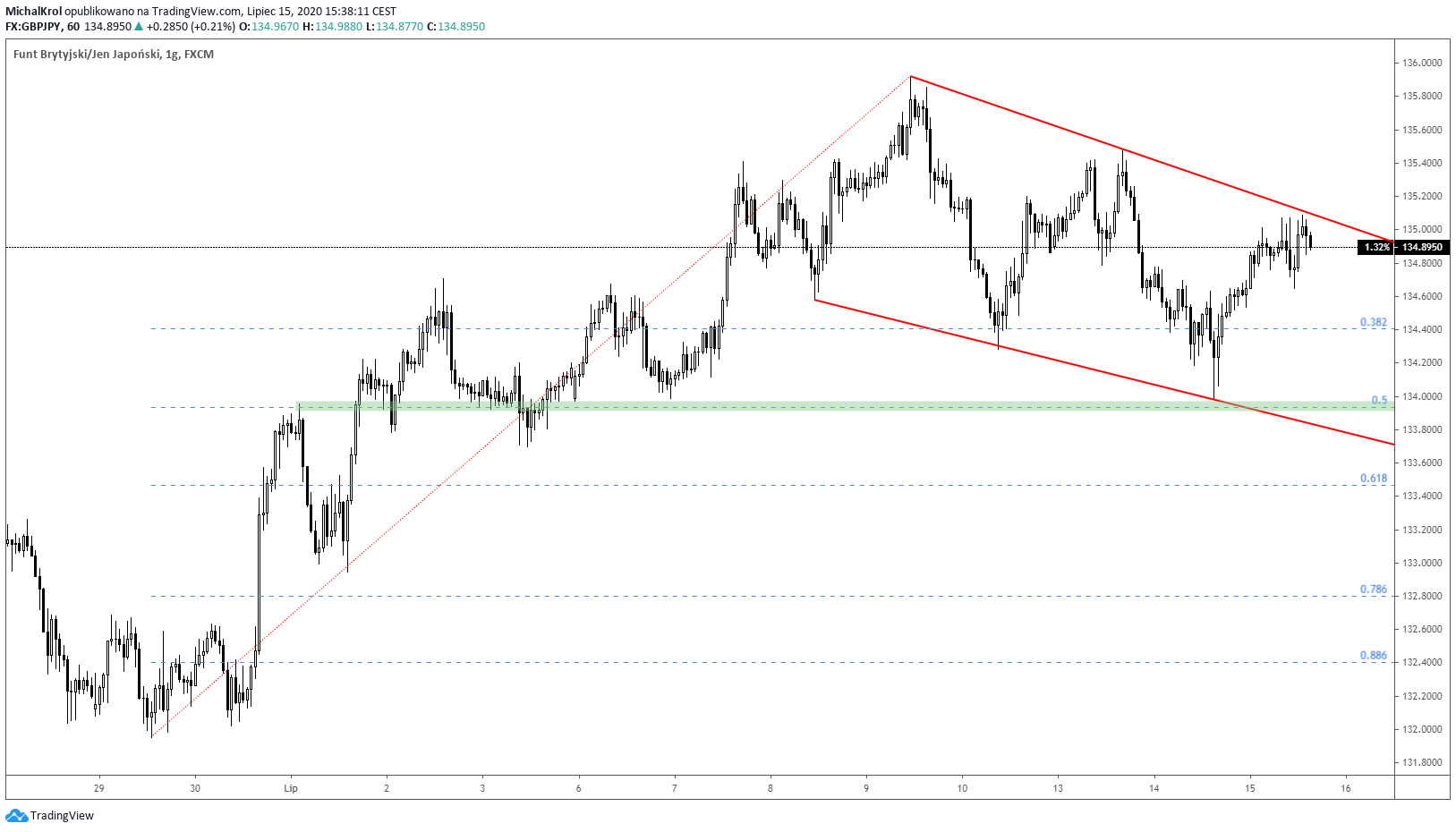 Analizę zaczynamy bowiem w rejonie kursu (132,00), a górna granica na ostatnim szczycie to pułap 136,00. W obecnym tygodniu pojawiła się korekta spadkowa, która niweluje część wcześniejszych wzrostów. W maksymalnym momencie rynek osiągnął już mierzenie 50% z całego swingu wzrostowego.
