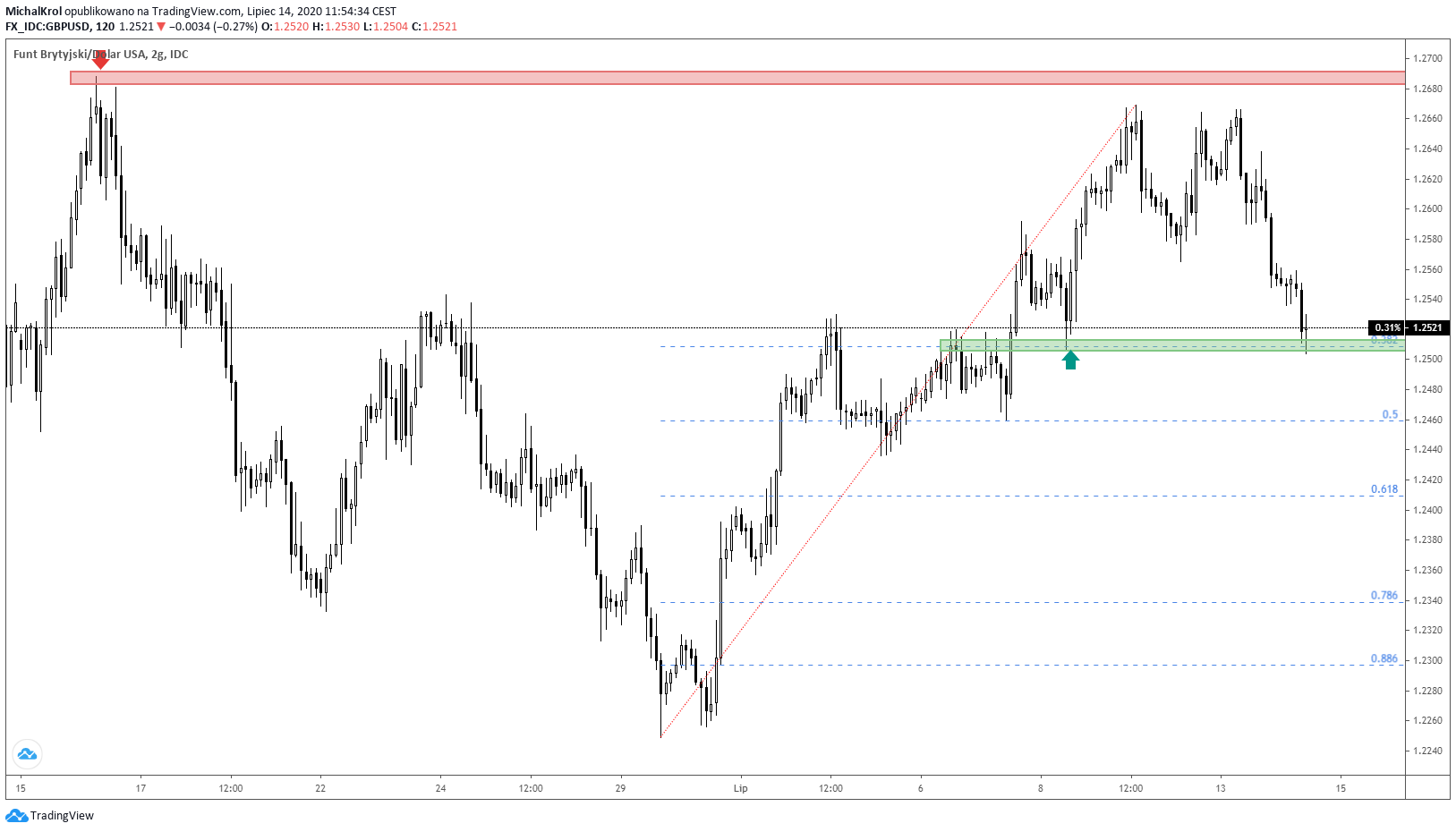 Obecna analiza opiera się o pomiar ostatniej fali wzrostowej, która dotyczy kilku sesji z początku lipca. Notowania wracają dziś do poziomu biegunowości po kursie 1,2510. Dodatkowym potwierdzeniem obszaru jest współczynnika Fibonacciego 38,2%.