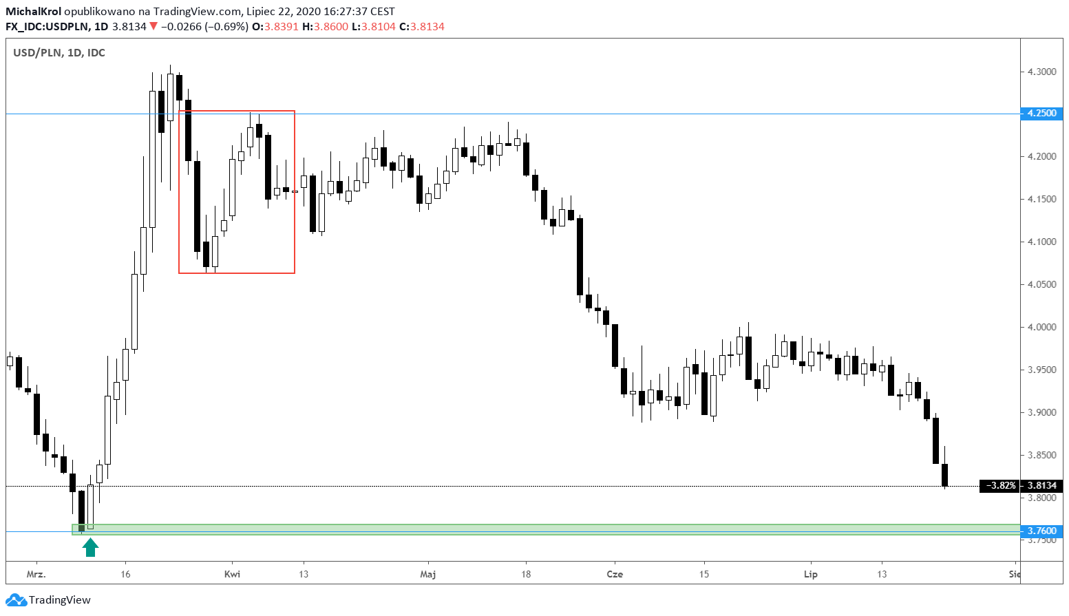 Patrząc na średnioterminowy wykres z użyciem interwału dziennego, kluczowym wydaje się być poziom cenowy 3,7600. Mamy tam ustanowione tegoroczne minimum i poziom, z którego rozpoczęły się marcowy rajd na północ. W dniu dzisiejszy kurs ponownie dynamicznie zbliża się do przytoczonego wsparcia. Przy utrzymaniu obecnej dynamiki powinniśmy zobaczyć oczekiwany target jeszcze w obecnym tygodniu.