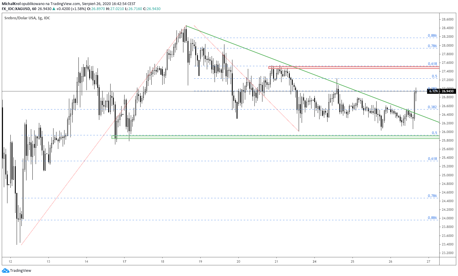 Elementem potwierdzającym zaangażowanie kupujących jest wybicie górnego ograniczenia formacji trójkąta. Po wejściu na rynek kapitał ze Stanów Zjednoczonych, kurs srebra wybija górą poziom cenowy 26,5 USD za uncję. Obecnym targetem jest pułap mierzenia 61,8% fibo, który znajduje się w strefie cenowej 27,5 USD.
