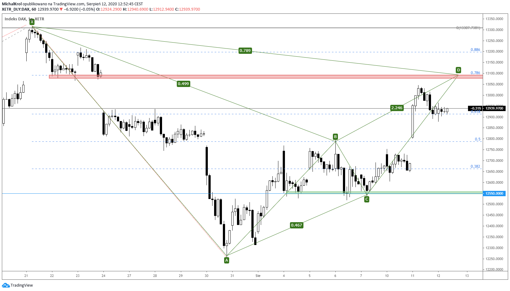 Zgodnie ze schematem Leonarda, punkt B układu znajduje się na wysokości mierzenia 50%. Ta część scenariusza została w pełni ukształtowana, a notowania zbliżają się do kluczowego współczynnika 78,6% fibo. Mamy tam punkt D struktury harmonicznej, a więc poziom zakończenia układu. Wyznaczony opór znajduje się na poziomie cenowym 13 100 punktów i jest potwierdzony silną biegunowością.