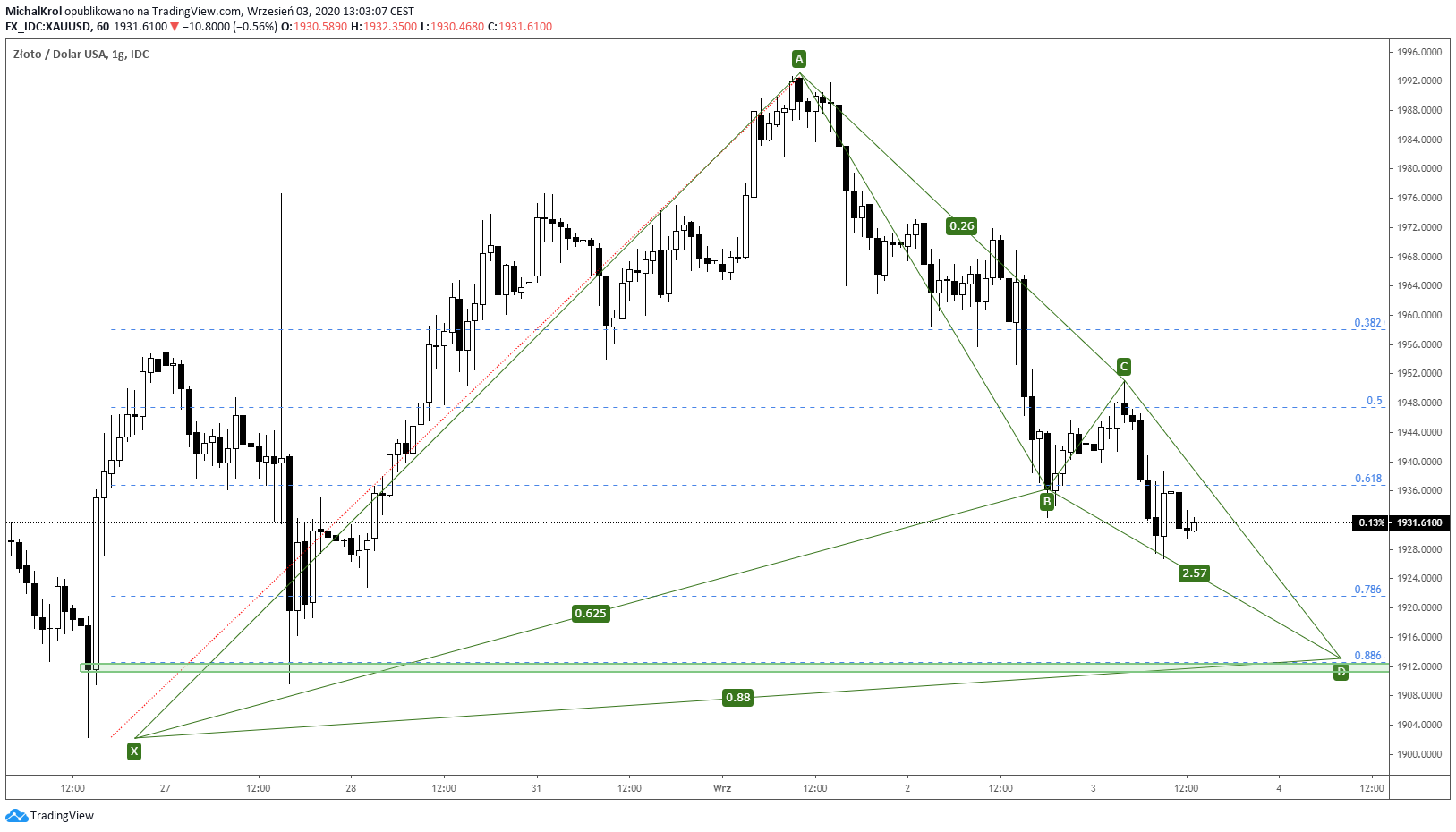 Poniższy wykres przedstawia notowania złota na interwale 1-godzinowym. Pozwala to zaprezentować dynamikę kursu w ujęciu ostatnich kilku sesji. Początek wykresu obejmuje lokalny dołek, który ukształtowany został na poziomie cenowym 1902 dolary za uncję.
