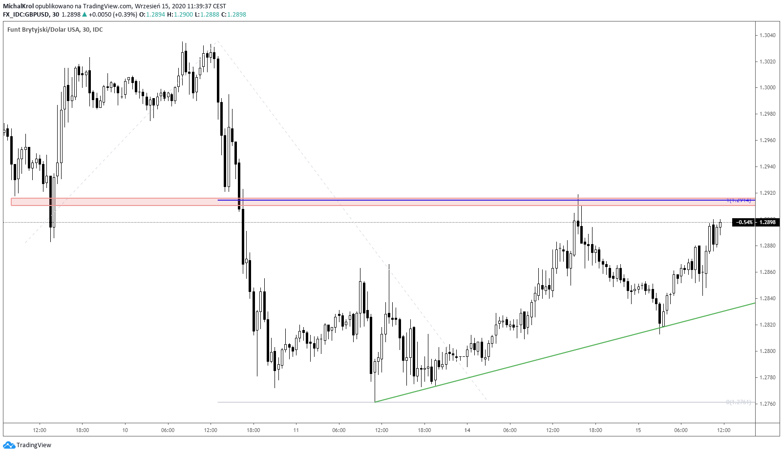Poniższy wykres przedstawia notowania pary walutowej GBPUSD na interwale 30-minutowym. Pozwala to zaprezentować wycenę Kabla w ostatnich kilku dniach. Lewa strona wykresu rozpoczyna się lokalne dołka na poziomie cenowym (1,2885), który jest jednocześnie części trendu spadkowego większego rzędu.