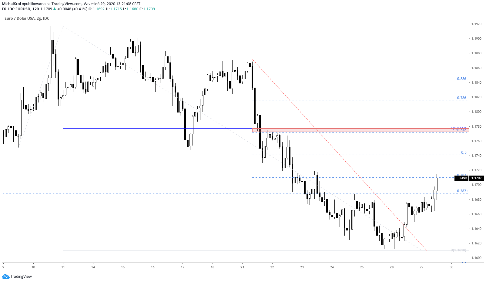 Targetem dla widocznego swingu wzrostowego jest strefa cenowa 1,1775 – 1,1780. Jest to opór, który oparty jest na mierzeniu FE100 z największej obecnie korekty wzrostowej oraz na wewnętrznym mierzeniu Fibonacciego 61,8%.