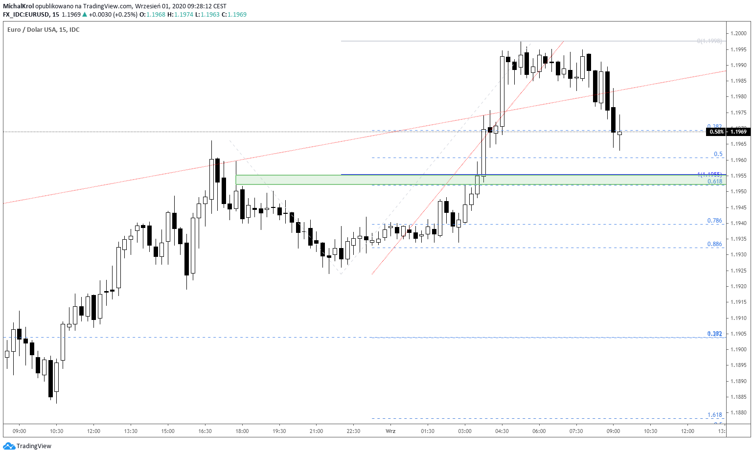 Po otwarciu wtorkowej sesji europejskiej wyprzedaży podlega wspólna waluta. Otwiera to przestrzeń dla scenariusza z lokalną korektą pędzącą. Przy zachowaniu równości odcinków z użyciem mierzenia FE100, mamy możliwość wyznaczyć strefę popytową ~ 1,1955. Dodatkowym potwierdzeniem jest silne mierzenie wewnętrzne 61,8% fibo, które odnosi się do pomiaru ostatniej fali wzrostowej.