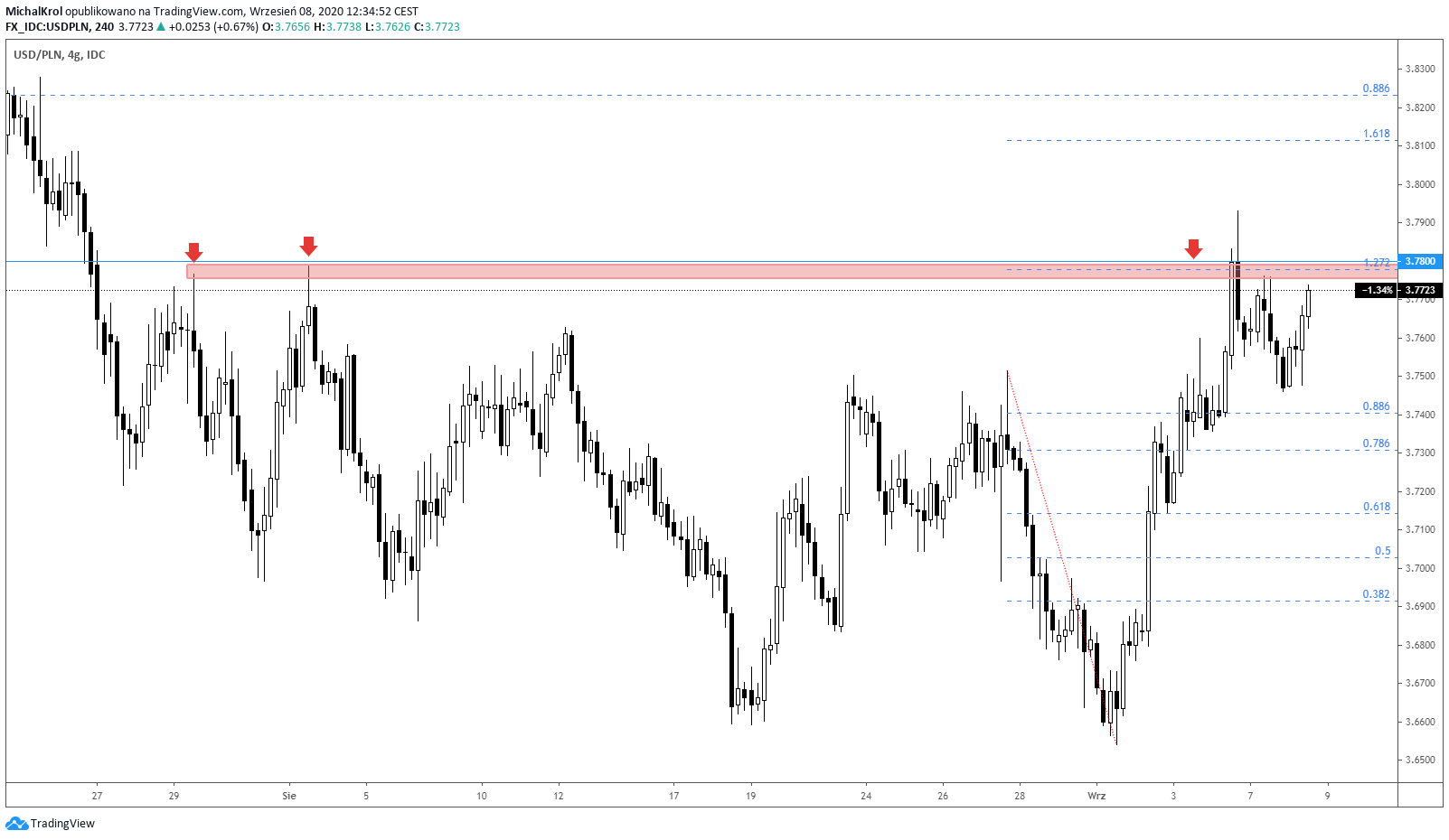 Podczas wtorkowej sesji obserwujemy kolejne reakcje kupujących, które utrzymują kurs USDPLNa ponad 3,7500. Jest to mocno związane z szeroką strefą podażową na wysokości zewnętrznego mierzenia Fibonacciego 127,2%. Odnosimy się tutaj do poziomu cenowego (3,7800), który był dynamicznie przetestowany podczas piątkowej sesji. Optymalnym interwałem transakcyjny powinny być świece 4-godzinowe.