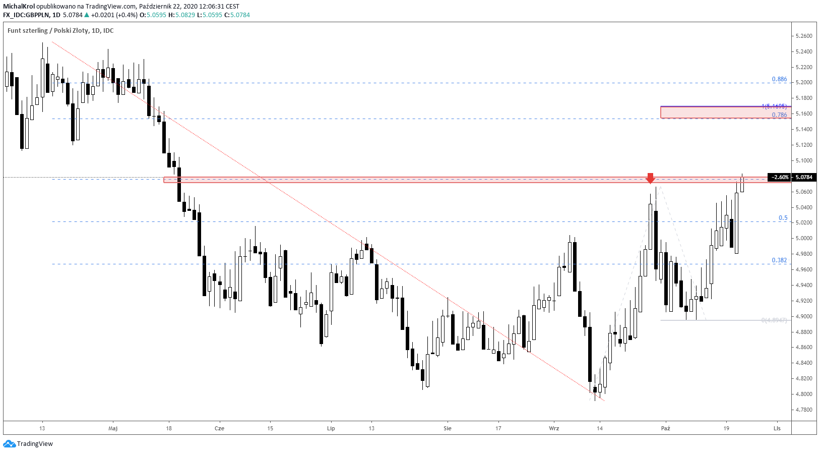 Mniej więcej od połowy września budowana jest szeroka korekta wzrostowa. Widoczna jest duża presja na trwały powrót wyceny ponad okrągłą barierę 5,0000. Dzisiejsza sesja może być kluczowa dla średnioterminowego trendu wzrostowego. Rynek bowiem testuje po raz kolejny poziom podażowy 5,0800. Jest to strefa oparta na silnym mierzeniu wewnętrznym Fibonacciego – 61,8%.Na uwagę zasługuje środowy strzał popytu, który ukształtował bardzo optymistyczną formację świecową.