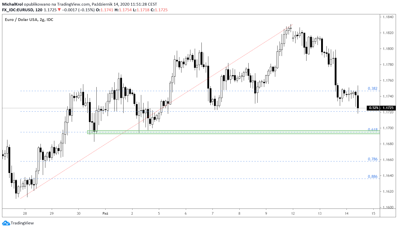 Otwarcie obecnego tygodnia przyniosło zmianę sentymentu na głównej parze walutowej. Do głosu doszła strona podażowa, a amerykański dolar umacnia się. Nasza uwagę kierujemy na najbliższy poziom wsparcia, który oparty jest na najsilniejszym mierzeniu wewnętrznym 61,8% fibo.