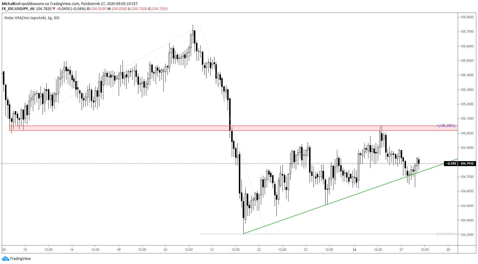 Poniedziałkowe popołudnie przyniosło pierwszy atak na strefę podażową 105,00 – 105,05. Jest to nadal aktualny poziom oporu, który opiera się na mierzeniu FE100 oraz silnej biegunowości. Widoczna reakcja sprzedających pozwala zarobić z krótkich pozycji około 40 pipsów.