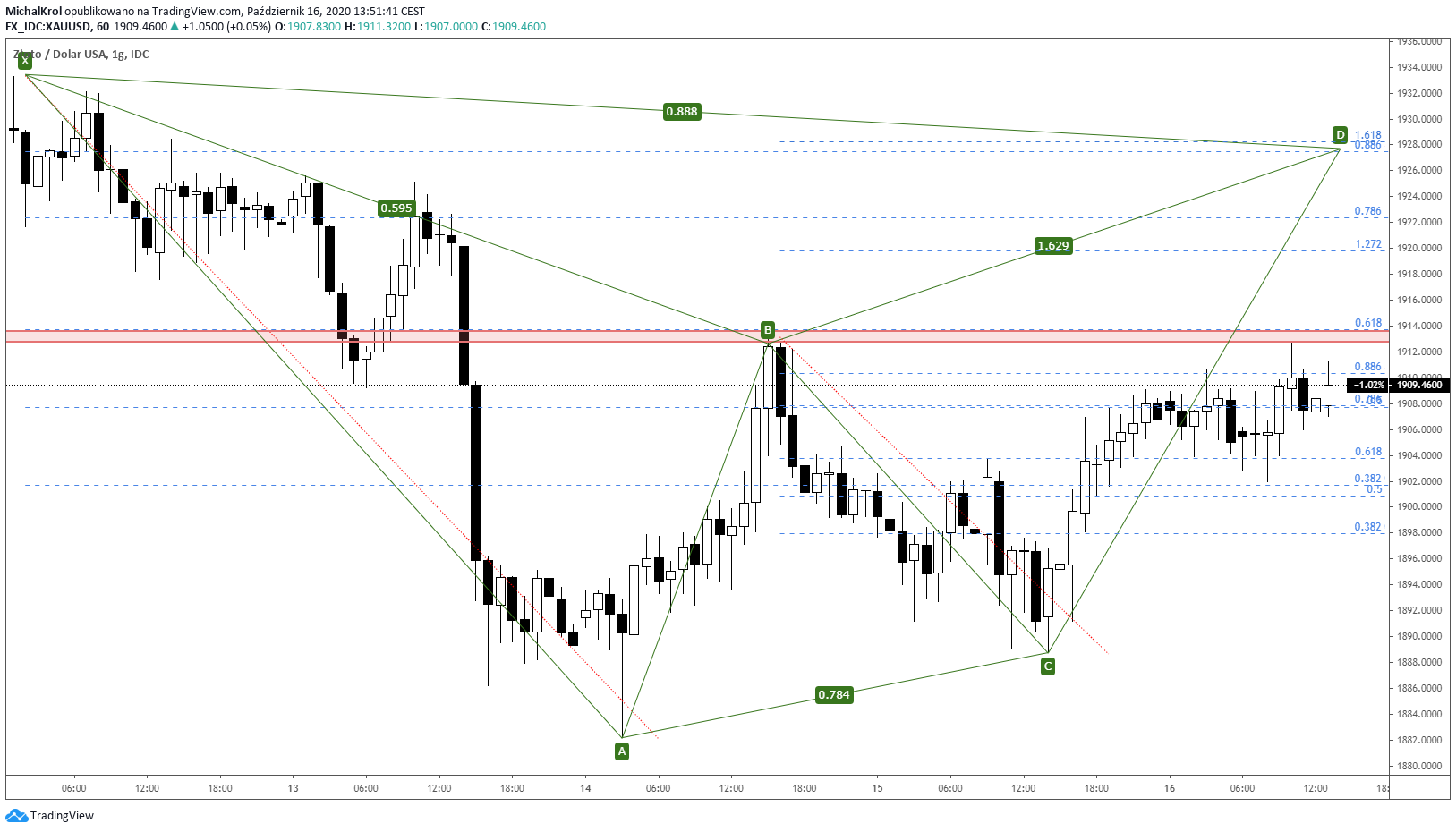 W przypadku wybicia górą wskazanej strefy, otworzy się schemat z dalszymi wzrostami. Celujemy tutaj w strefę cenową 1928 dolarów za uncję, gdzie znajduje się punkt D formacji harmonicznej FT Pattern.
