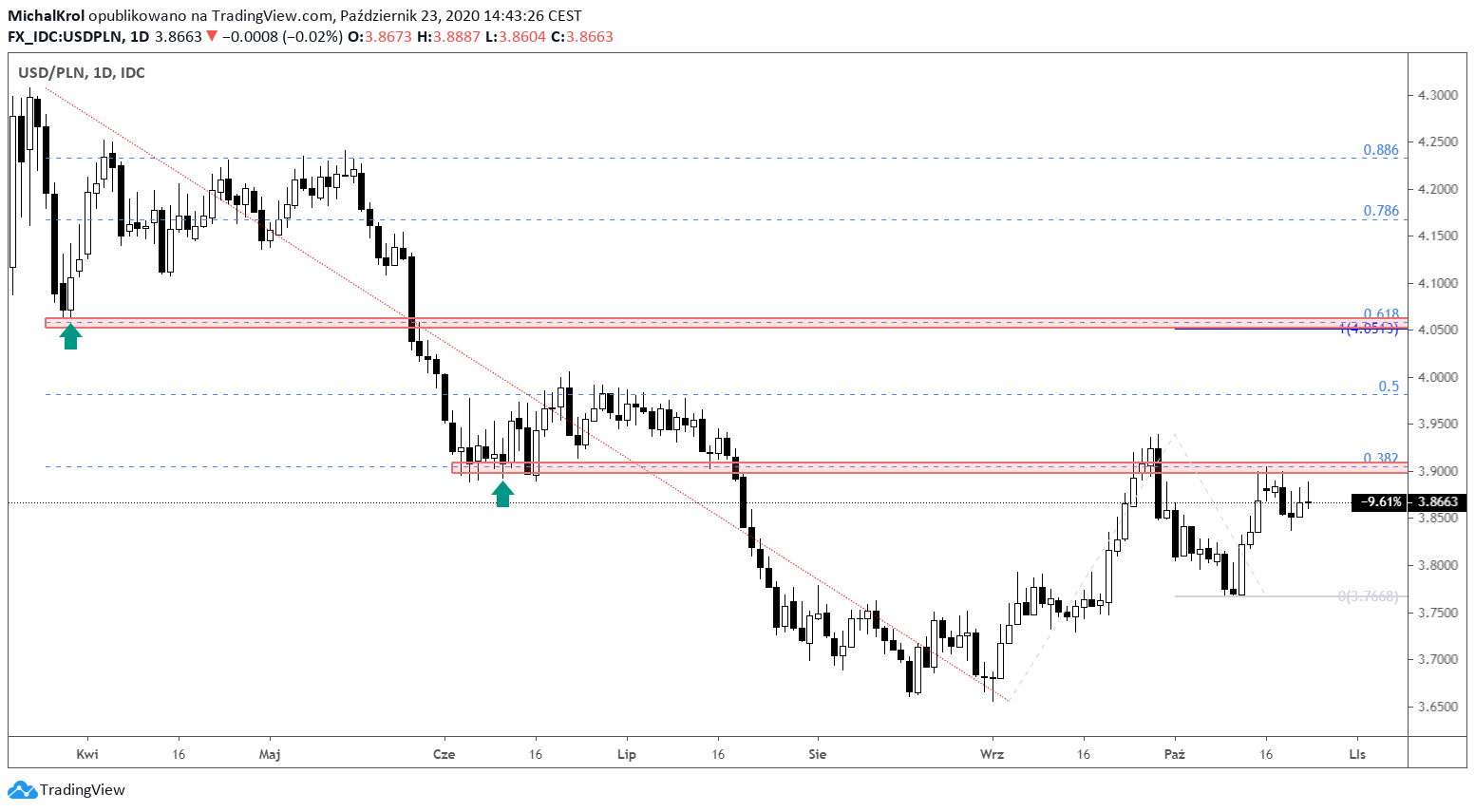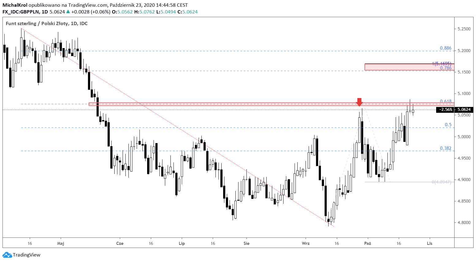 Tegoroczne minimum zostało ukształtowane mniej więcej w połowie września. Po tym fakcie widzimy sporą presję kupujących na powrót notowań powyżej okrągłej i psychologicznej bariery 5,0000. Druga część bieżącego tygodnia przynosi kolejny test kluczowej strefy podażowej ~ 5,0750. Mamy tam silne mierzenie Fibonacciego 61,8% oraz spadkowe formacje świecowe.