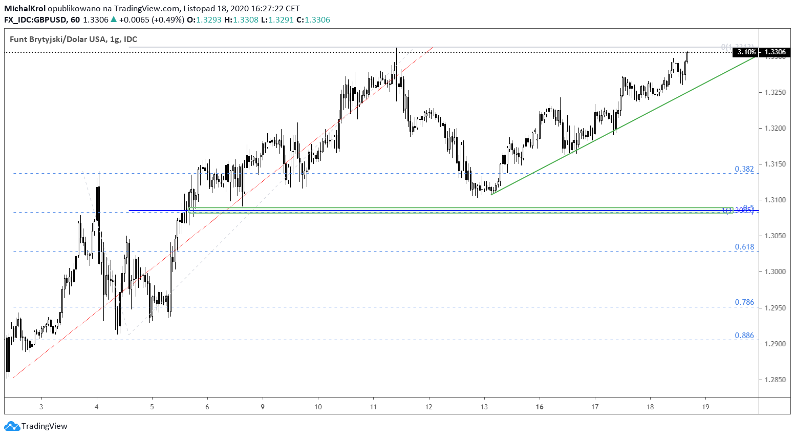 Od sesji 13 listopada na wykresie GBPUSD zarysował się wyraźny trend wzrostowy. Notowania podążają zgodnie z poprowadzoną linia zieloną. Dolne ograniczenie jest precyzyjnie utrzymywane przez notowania, a wycena Kabla osiąga ostatnie maksimum ~ 1,3320. Będzie to kluczowy moment dla kontynuacji kierunku północnego. Ewentualne wybicie górą da silny sygnał dla kupujących brytyjską walutę.