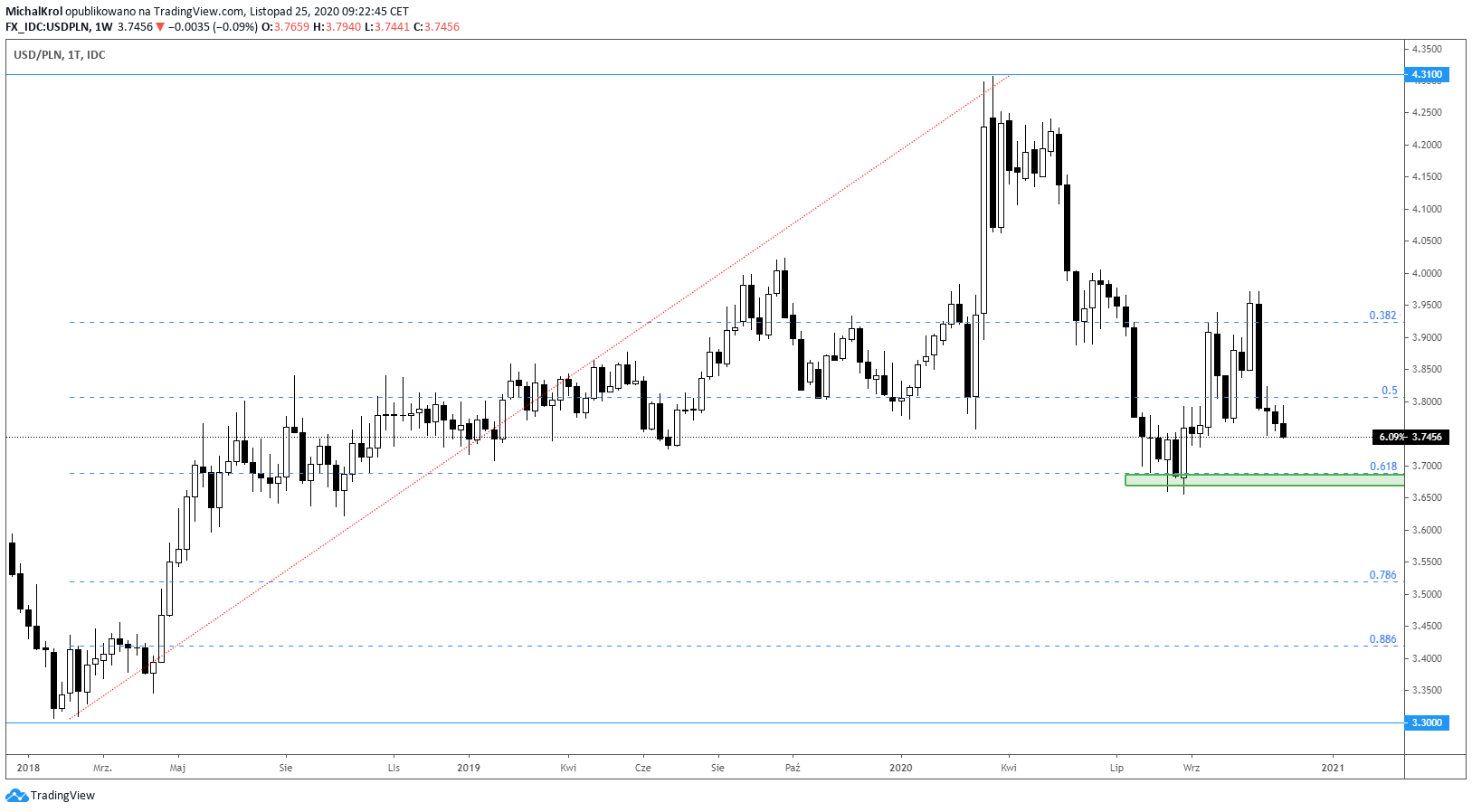 Listopad przybliża wycenę USDPLN-a do sierpniowych dołków. Są one oparte na szerokim mierzeniu Fibonacciego 61,8% po kursie 3,6900. Poziom ten może okazać się po raz kolejny silnym wsparciem, ale również punktem B dla potencjalnej formacji harmonicznej.