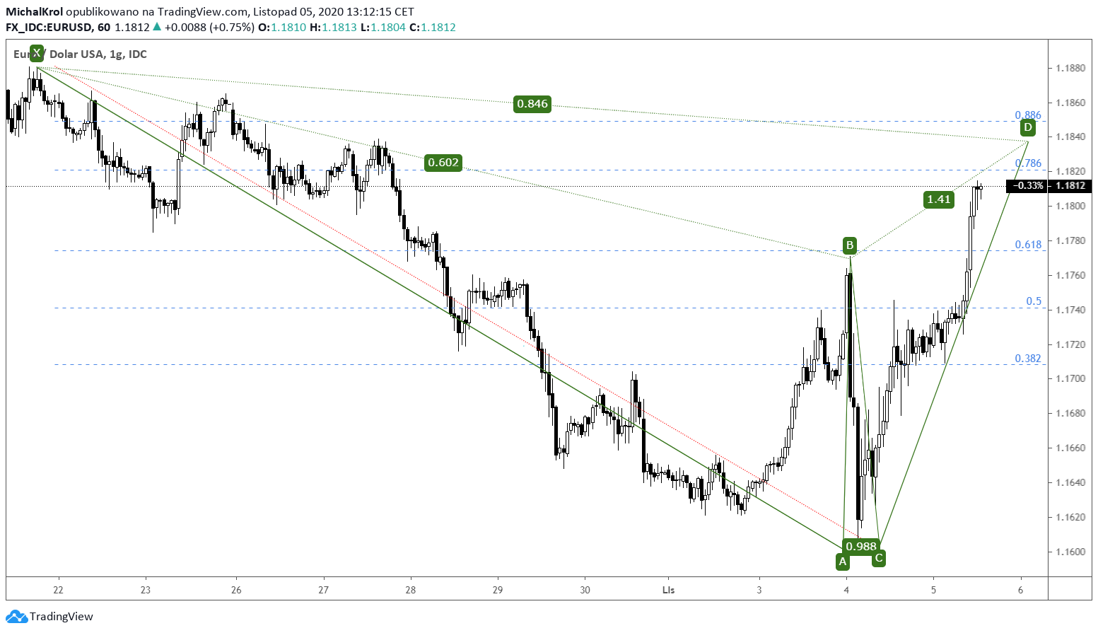 Dynamiczne wzrosty pozwalają wyznaczyć perspektywę techniczną opartą na układzie harmonicznym. Zwracam tutaj uwagę na głębokie mierzenia wewnętrzne 78,6% fibo oraz 88,6% fibo. W zależności od dodatkowych potwierdzeń to poziomy 1,1820 i 1,1850 mogą stanowić punkty zwrotne na EURUSD.