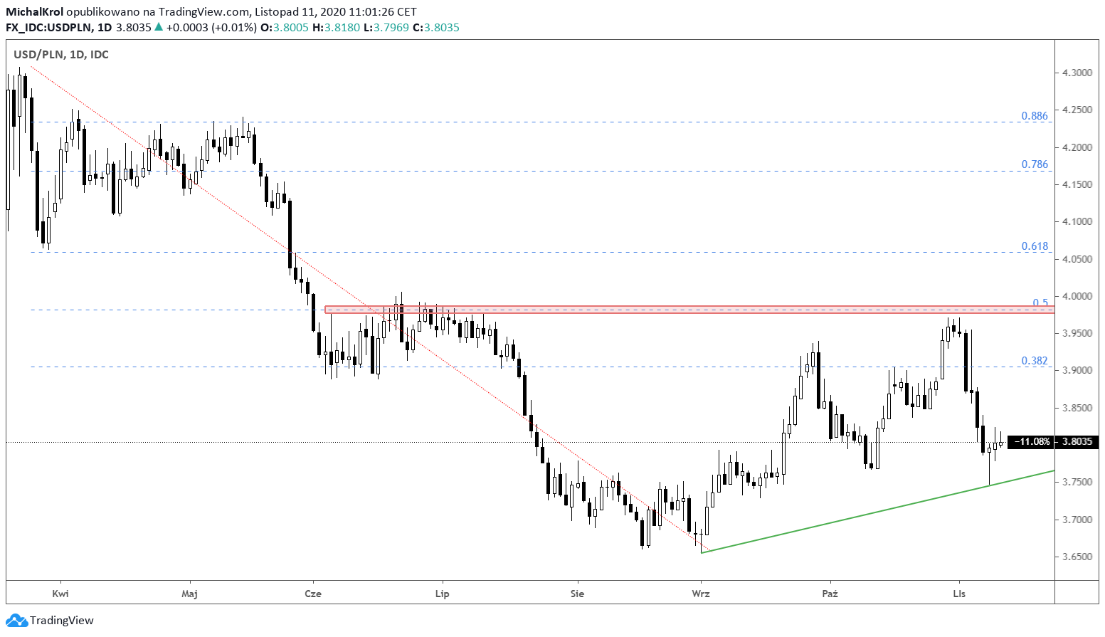 Amerykańskie wybory prezydenckie wpływają ostatecznie na osłabienie dolara. Kapitał płynie na rynki akcyjne oraz do walut bardziej egzotycznych, w tym do PLN-a. Szerokim oporem pozostaje strefa mierzenia 50% po cenie 3,9800. Po ostatnich dołkach prowadzimy również poglądową linię dolnego ograniczenia.