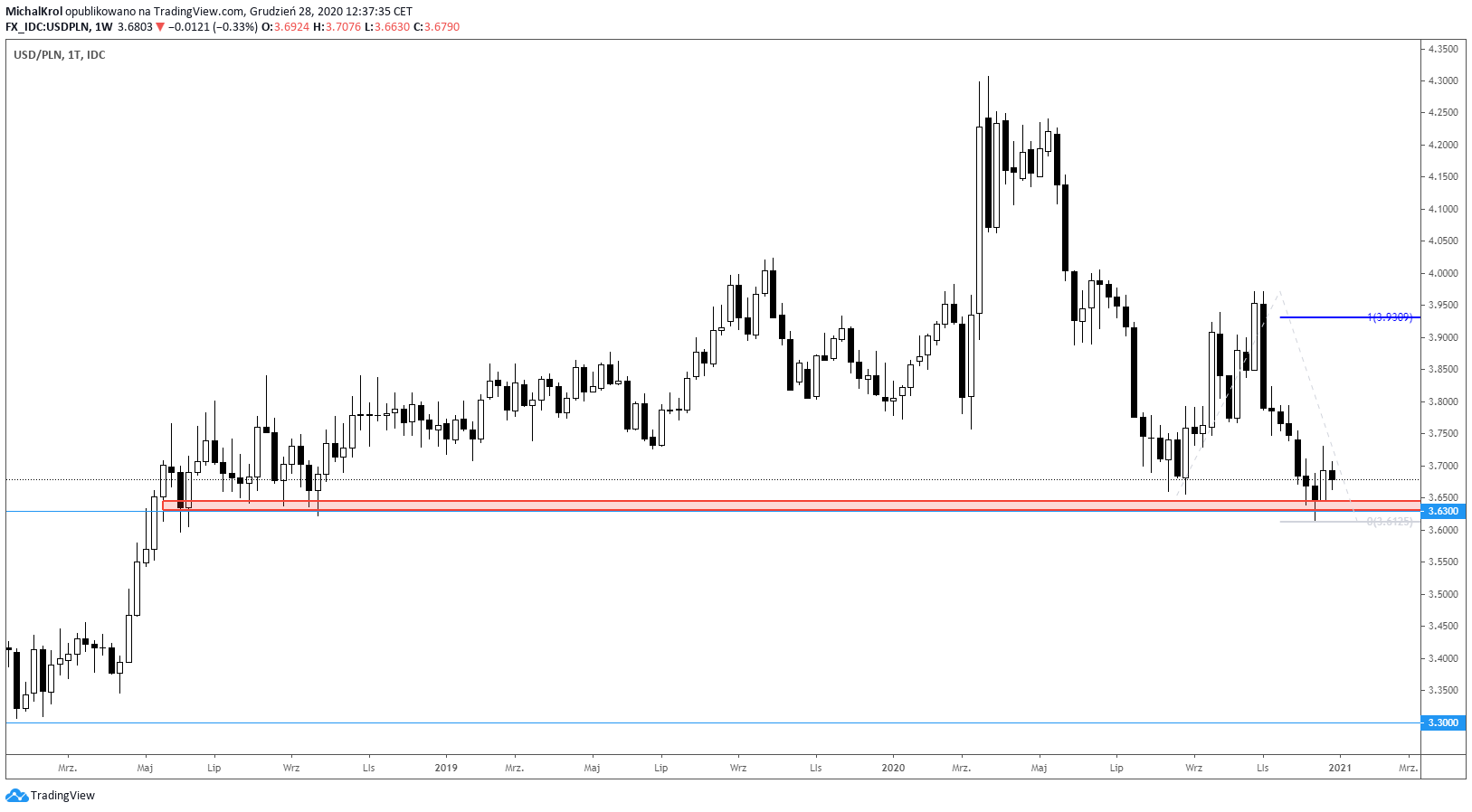 Poniższy wykres przedstawia notowania pary walutowej USDPLN na szerokim interwale tygodniowym. Pozwala to zaprezentować dynamikę rynkową na przestrzeni ostatnich trzech lat. W tym czasie notowania ukształtowały zakres wahań o rozpiętości mniej więcej 10 000 pipsów.
