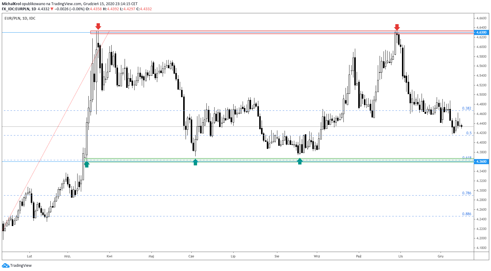 Obecnie jesteśmy w stanie wyznaczyć dość szeroki range cenowy na rynku EURPLN-a. Notowania dwukrotnie potwierdzały górne ograniczenie na wysokości 4,6300. Nadal aktualnym poziomem średnioterminowego wsparcia pozostaje pułap współczynnika Fibonacciego 61,8%. Ostatnie sesje przynoszą kolejne spadki i przybliżają kurs do wskazanej strefy popytowej ~ 4,3600.