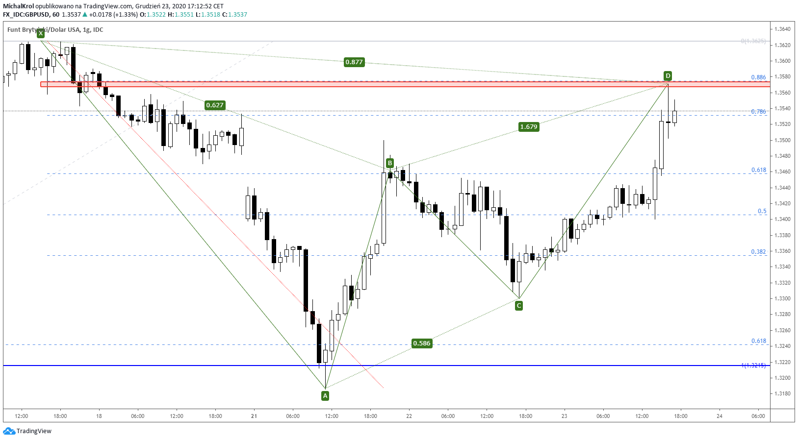 Poniedziałkowe południe przyniosło zmianę sentymentu na wykresie Kabla. Rynek dynamicznie zniósł ponad 60% wcześniejszych spadków, a w kolejnym dniu dołożył kolejne wzrosty. Sesja amerykańska przynosi pierwszy test strefy podażowej 1,3575. Poziom ten został wyznaczony z układu harmonicznego FT Pattern, gdzie punkt D znajduje się na wysokości mierzenia Fibonacciego 88,6%.