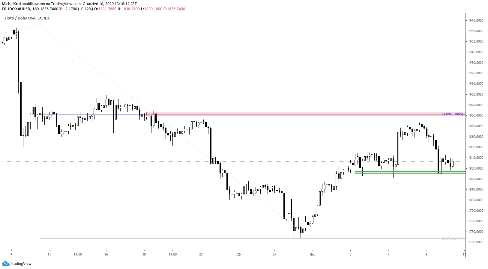 Grudzień rozpoczął się od wyraźnej zmiany sentymentu. W ramach schematu korekcyjnego wykorzystujemy mierzenie FE100, które wyznacza nam silną strefę oporu. Mowa tutaj o poziomie cenowym 1 881 dolarów, który potwierdzają wcześniejsze wierzchołki. W ujęciu bardziej lokalnym, na uwagę zasługuje strefa wsparcia 1 825 USD, który od wczoraj stanowi ciekawy układ na wzrosty.