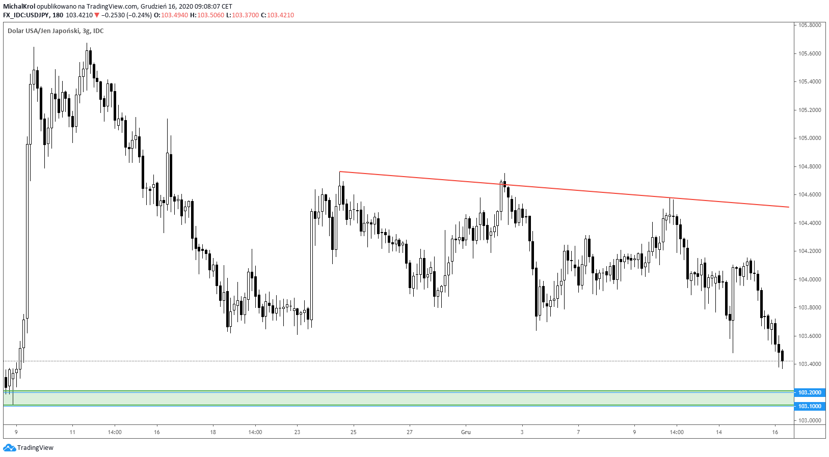 Poniższy wykres prezentuje notowania pary walutowej USDJPY na interwale 3-godzinowym. Pozwala to zaprezentować dynamikę wahań na przestrzeni ostatnich kilku tygodni. W tym czasie notowania wyznaczyły przedział cenowy na poziomie 260 pipsów. Lewa strona wykresu rozpoczyna się od pamiętnej sesji w dniu 9 listopada, kiedy na rynku pojawiła się informacja o szczepionce na COVID-19. Ten fakt doprowadził do dynamicznego wybicia w górę, które było spowodowane migracją kapitału z japońskiego jena.