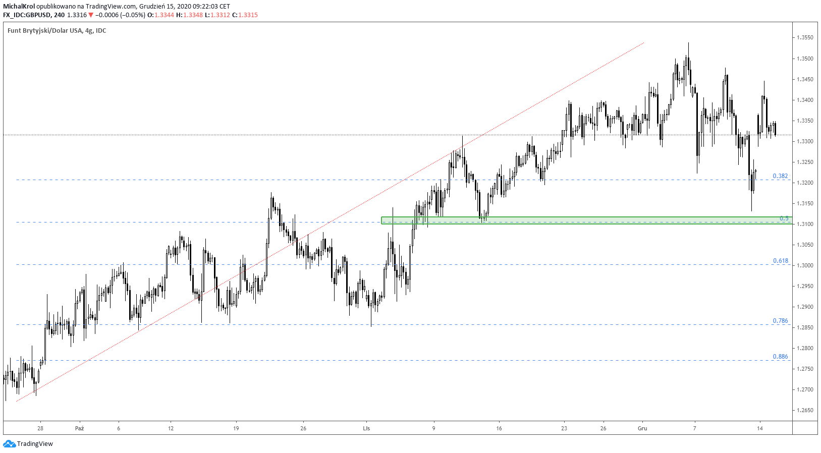 Lewa strona wykresu rozpoczyna się od dołka w okolicy ~ 1,2650. Po tym fakcie na rynku funta pojawił się silny popyt. Przez cały październik i listopad brytyjska waluta wyraźnie zyskiwała do amerykańskiego dolara. Doprowadziło to do osiągniecia średnioterminowego szczytu po cenie 1,3550.