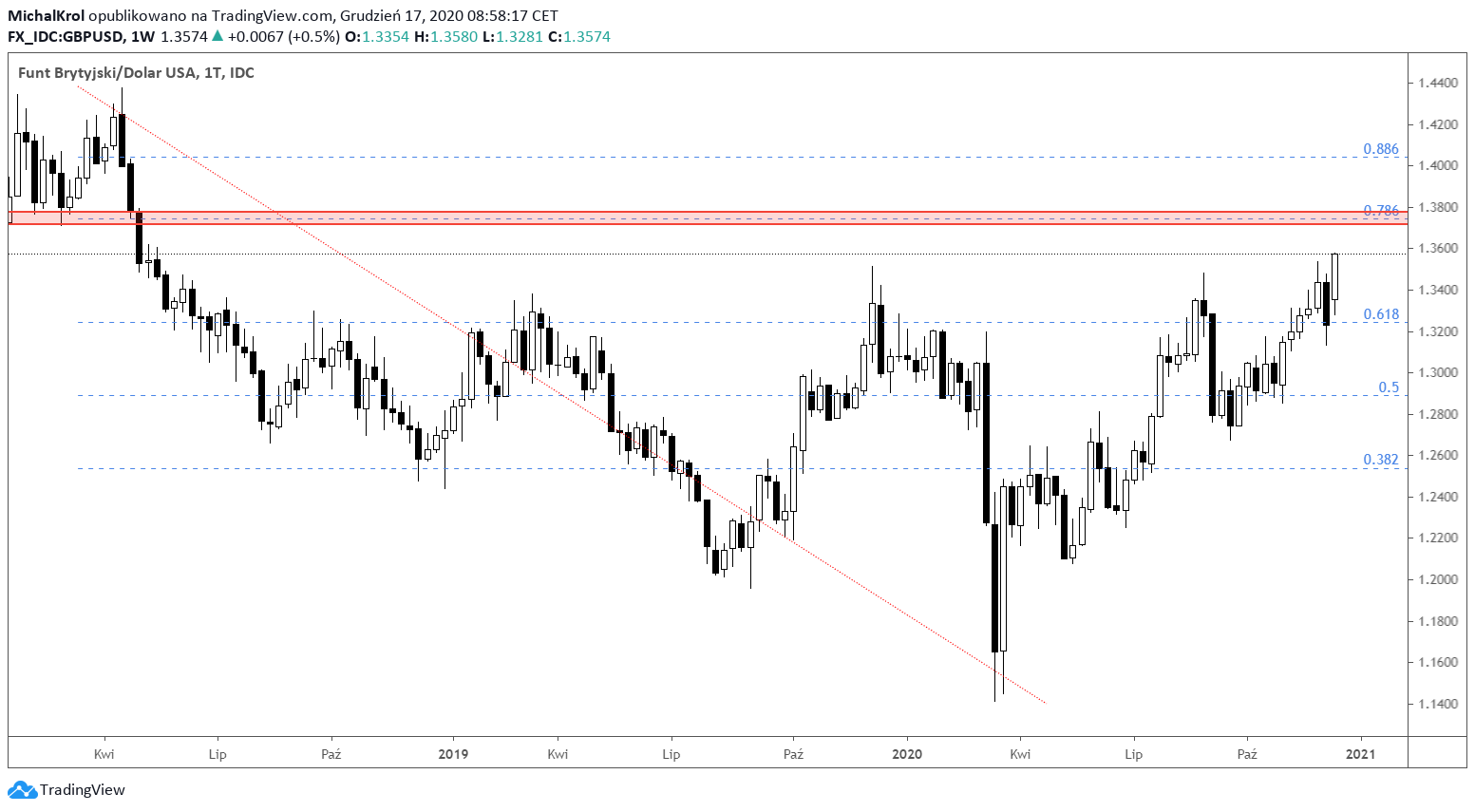 Lewa strona wykresu rozpoczyna się od podwójnego szczytu na rekordowych wycenach ~ 1,4400. W kolejnych miesiącach amerykański dolar zyskiwał na wartości do brytyjskiego funta. Trend spadkowy osiągnął swój koniec w momencie poprawy sentymentu na rynkach finansowych. Spadek awersji do ryzyka wpłynął na transfer kapitału z amerykańskiego dolara do bardziej ryzykownych aktywów.