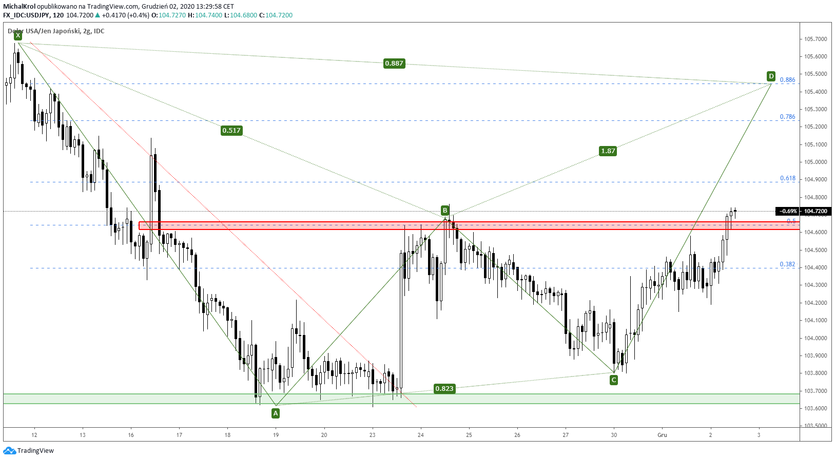 W dniu dzisiejszym pojawia się ciekawe rozstrzygniecie techniczne na rynku USDJPY. Notowania wybijają silny opór, który stanowił dotychczasowe ograniczenie górne. Zgodnie z tym co wspominałem na porannym przeglądzie rynkowym, jest to scenariusz, który otwiera przestrzeń dla układu harmonicznego. Celujemy tutaj we wzrosty na poziomy głębokich mierzeń wewnętrznych, a więc 78,6% fibo po kursie 105,35 oraz 88,6% fibo po kursie 105,45.
