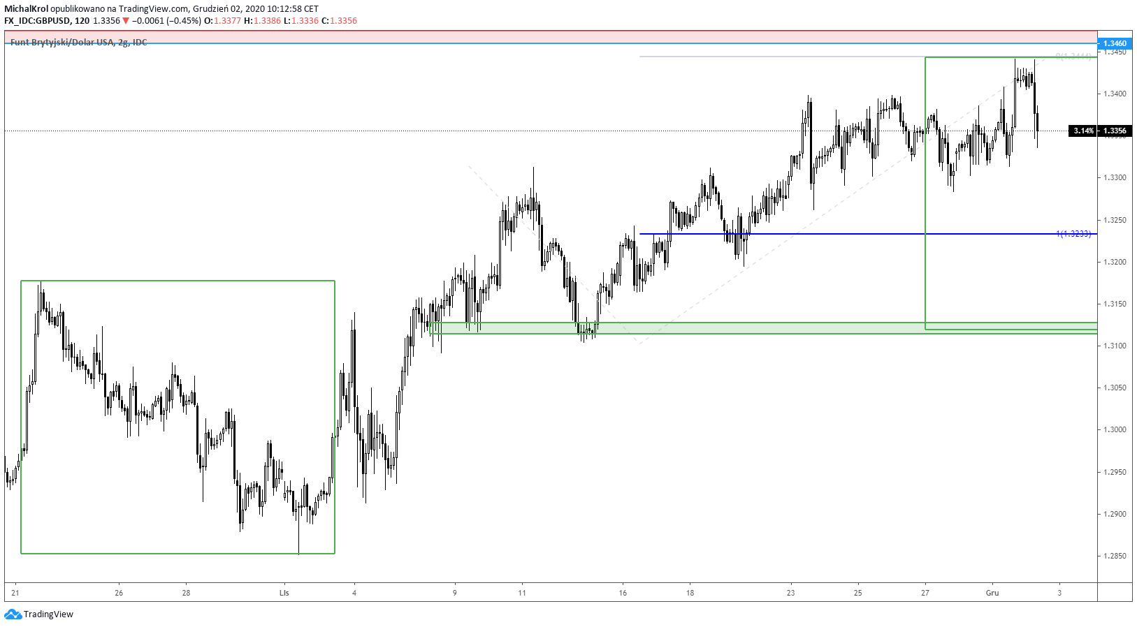 Lewa strona wykresu rozpoczyna się od szerokiej korekty spadkowej, której minimum wyznaczył dołek po cenie 1,2850. Początek listopada przyniósł zwrot notowań na północ, który utrzymywany był do przełomu miesiąca. W międzyczasie pojawiły się też bardziej lokalne korekty, które wykorzystamy dla obecnych scenariuszy technicznych.