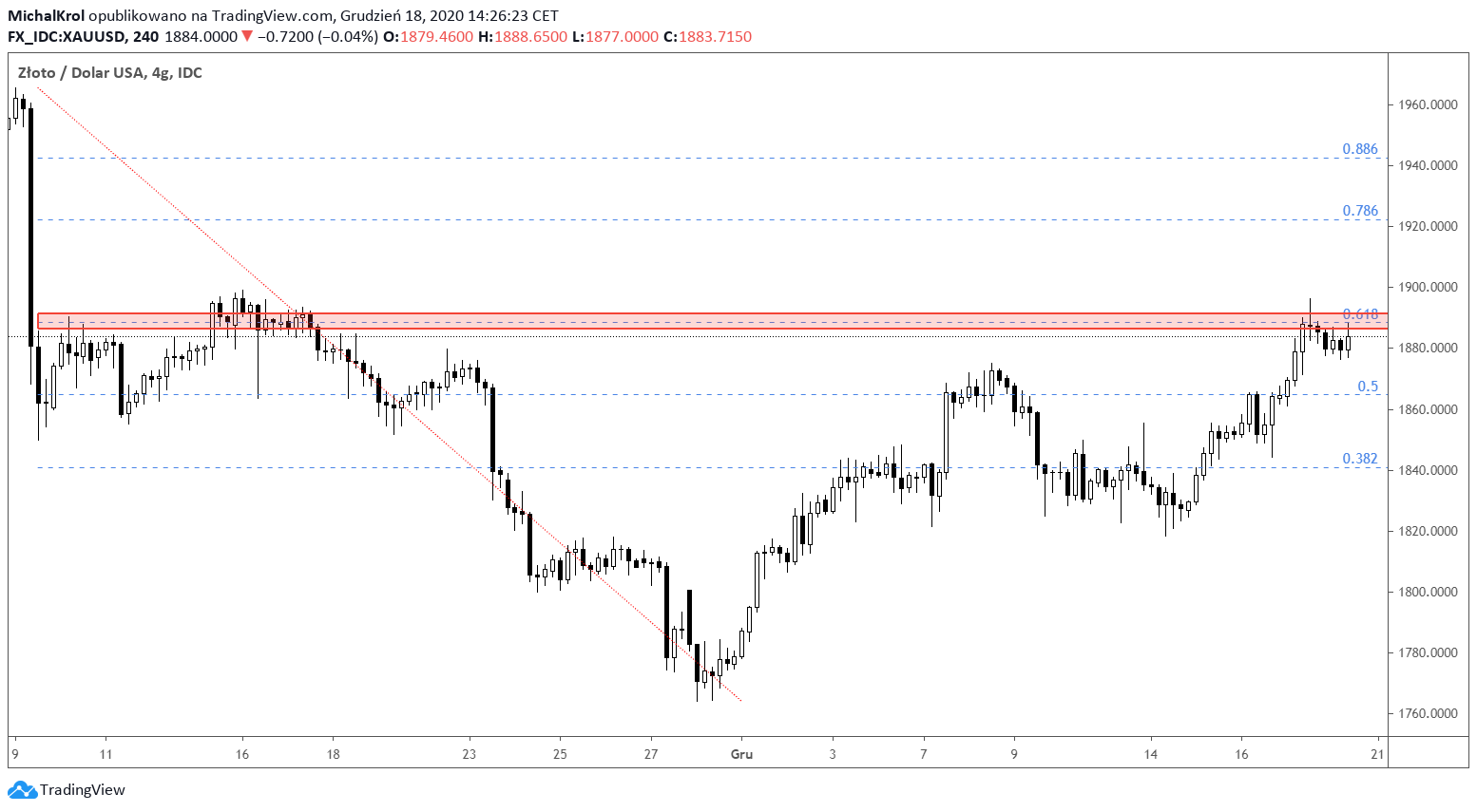 Grudzień charakteryzuje duża słabość amerykańskiego dolara, która przekłada się na nominalny wzrost wartości złota. Obecnie notowania osiągają średnioterminową strefę oporu, która oparta jest na silnym mierzeniu wewnętrznym 61,8% fibo. Wskazany poziom podażowy to pułap cenowy 1890 dolarów, gdzie w listopadzie pojawiło się wyraźne zaangażowanie sprzedajacych.