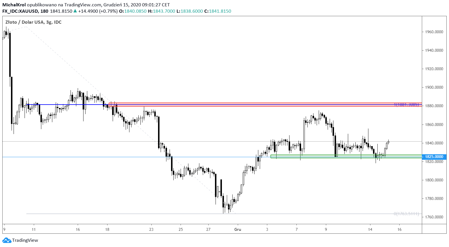 Lewa strona wykresu rozpoczyna się w okolicy wierzchołka po cenie 1965 – 1970 USD. Zaraz potem na wykresie pojawiło się dynamiczne zrzucenie na południe. Była to poniedziałkowa sesja z informacją o powstałej szczepionce na COVID-19 co miało przełożenie na duży optymizm na rynkach akcyjnych.