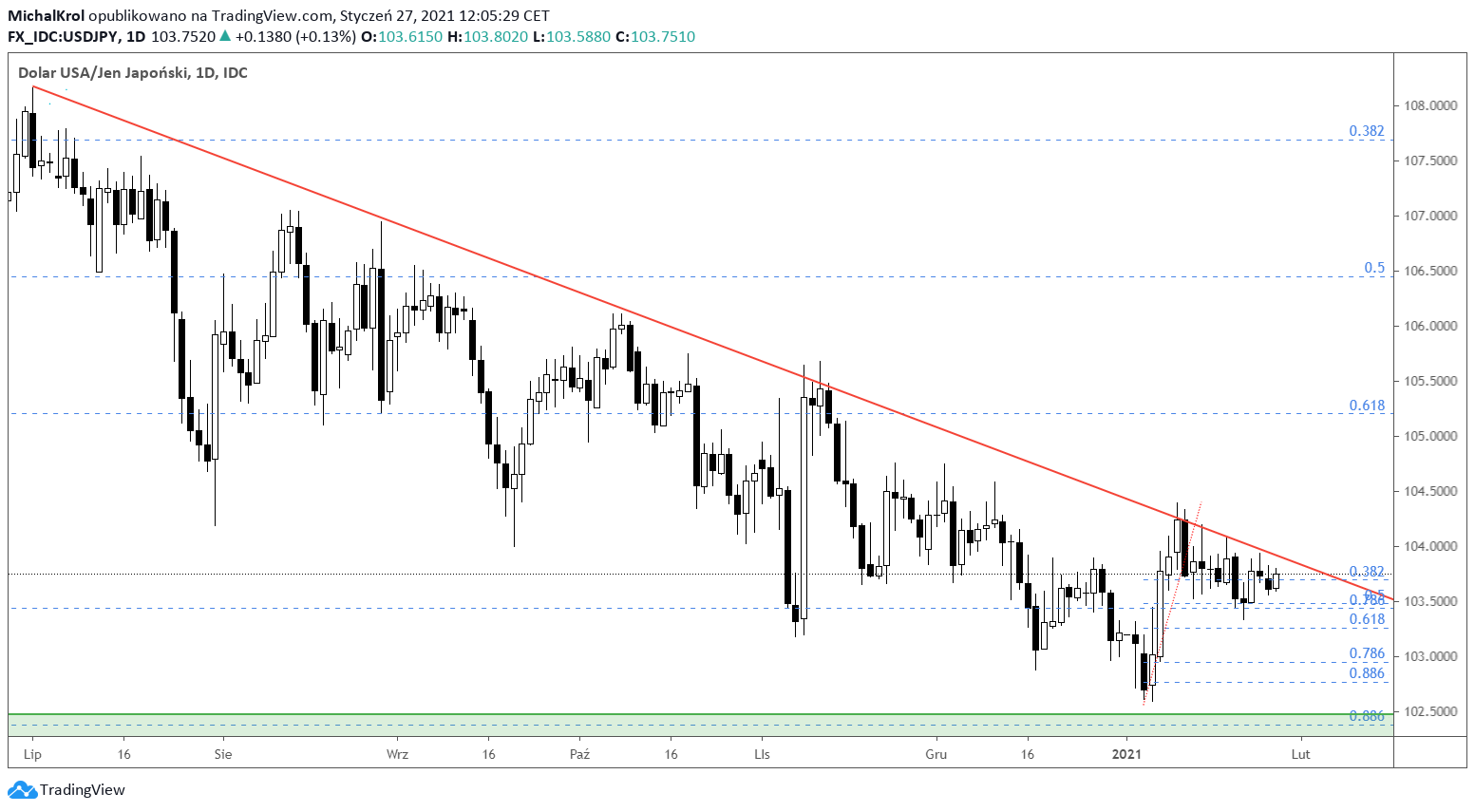Linia trendu spadkowego na powyższym wykresie doskonale potwierdza proste rozwiązania techniczne. Notowania bardzo precyzyjnie utrzymują górne ograniczenie od ponad pół roku. Wraz z rozpoczęciem stycznia zaangażowanie kupujących wyraźnie rośnie. Coraz bardziej prawdopodobne staje się wybicie górą. Z czasem zawęża się oczywiście przestrzeń dla zmienności, którą wydziela od dołu strefa popytowa 102,40.