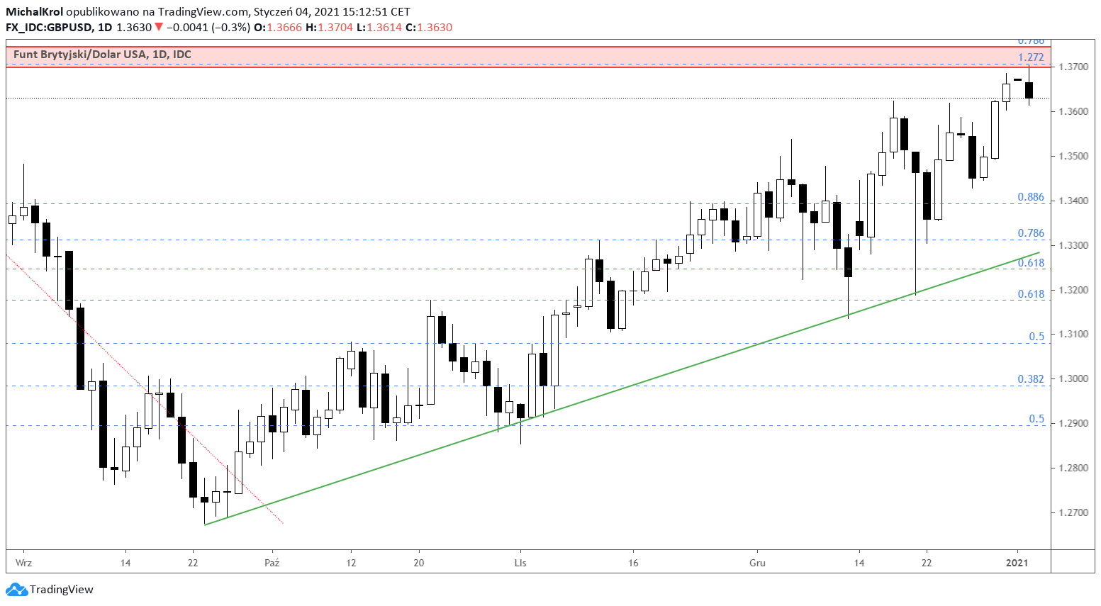 Lewa strona wykresu rozpoczyna się od korekty spadkowej, po której cena wyznaczyła dołek ~ 1,2700. Początek października przyniósł jednak zmianę sentymentu na parze walutowej GBPUSD. Kapitał ponownie zaczął płynąc do funta brytyjskiego, a wyprzedawany był amerykański dolar. Taki schemat utrzymywany był w zasadzie do końca 2020 roku.