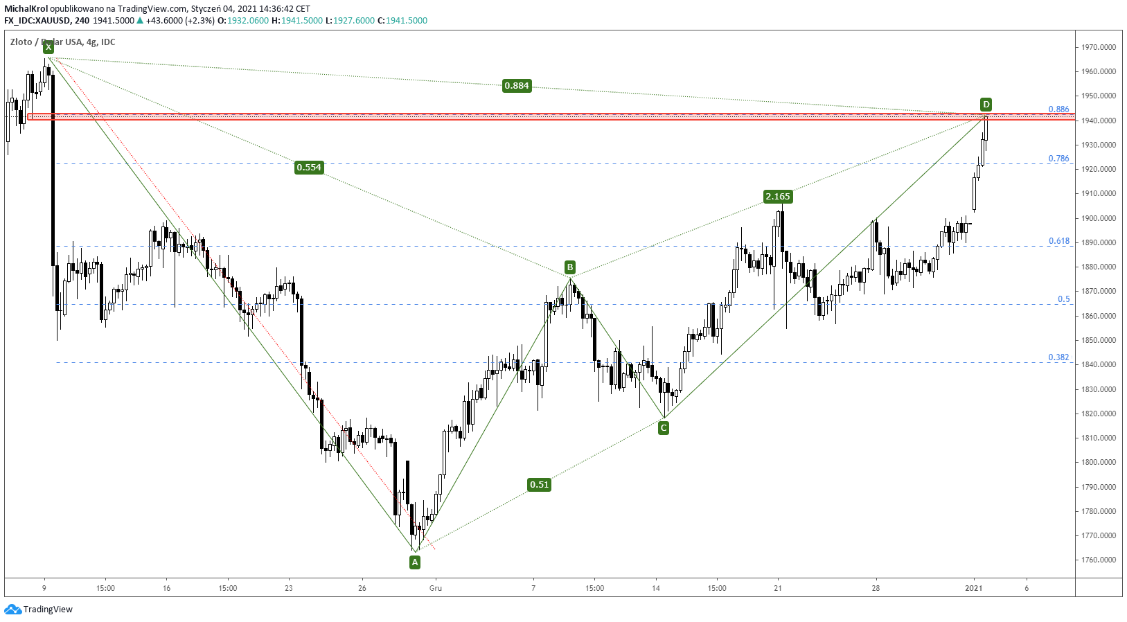 Grudzień przyniósł wyraźną zmianę sentymentu na rynku metali szlachetnych. W przypadku GOLD ceny odbiły się rejonu 1 760 dolarów za uncję. Rok 202 zakończył się w rejonie okrągłej strefy cenowej 1 900 dolarów za uncję. Otwarcie stycznia przynosi kontynuację trendu wzrostowego. Rynek osiąga właśnie strefę podażową na wysokości głębokiego mierzenia wewnętrznego 88,6% fibo. Jest to zarazem punkt D układu harmonicznego Nietoperza. Prezentowany opór to kurs 1 942 dolarów za uncję.
