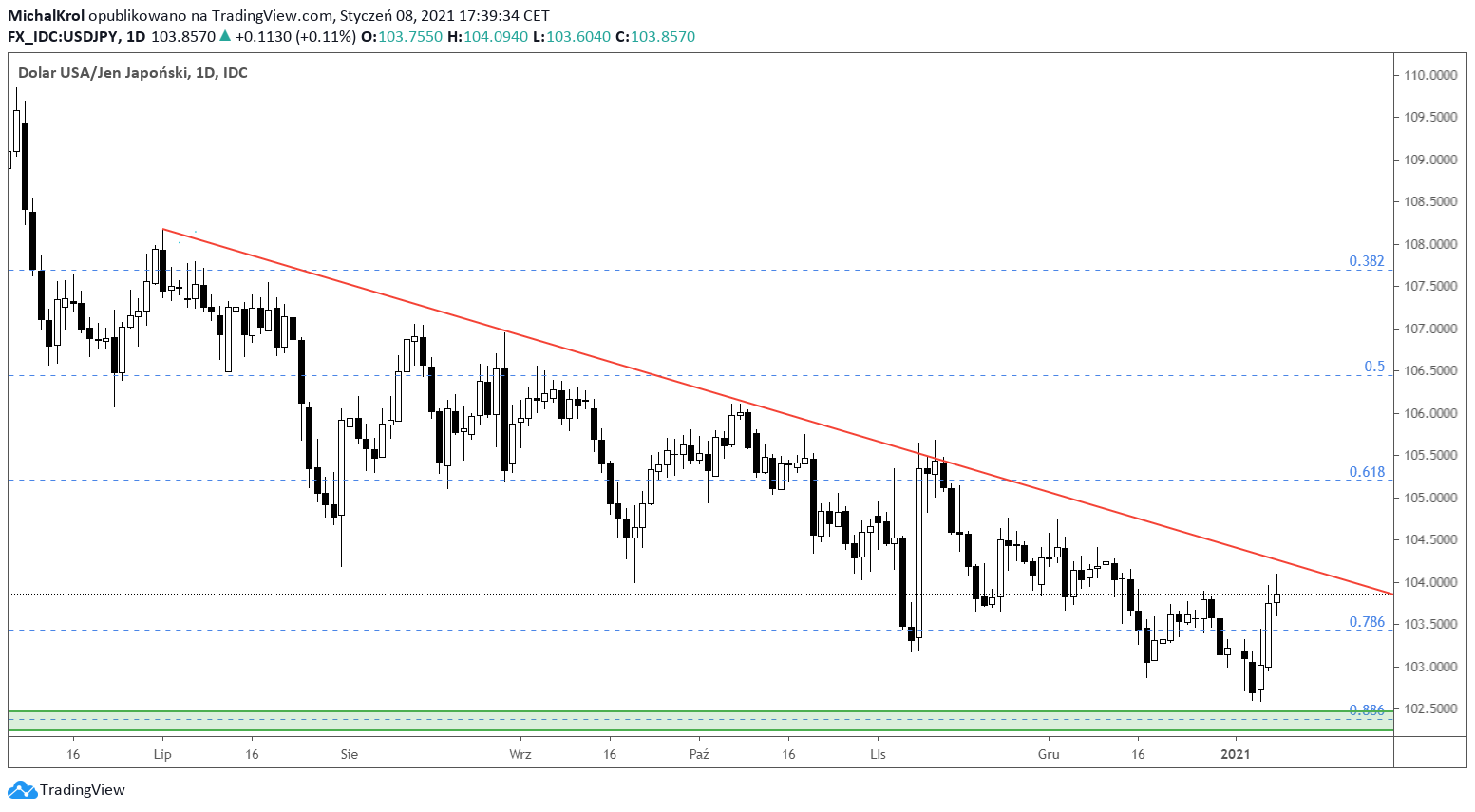 Styczeń rozpoczyna się od wzmożonej aktywności na rynku amerykańskiego dolara. Pojawia się popyt na USD, który skutkuje ukształtowaniem dołka na wykresie USDJPY. Notowania odbiły na północ nieco powyżej strefy wsparcia ~ 102,50. Poziom wyznaczony jest w oparciu o głębokie mierzenie wewnętrzne 88,6% fibo.