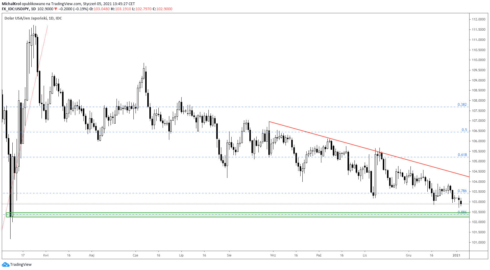Początek roku 2021 przybliża wycenę Ujka do szerokiej strefy wsparcia. Bazujemy tutaj na głębokim mierzeniu wewnętrznym 88,6% fibo. Wskazywana strefa popytowa znajduje się na poziomie cenowym 102,30. Jest to również pułap zamknięcia wspominanej wcześniej świecy spadkowej, po której notowania ukształtowały ubiegłoroczne minima. Widoczna obecnie zmienność jest bardzo odległa od tej z pierwszego kwartału 2020, ale napływające wtedy zaskoczenia ze sfery makroekonomicznej również były większej wagi.